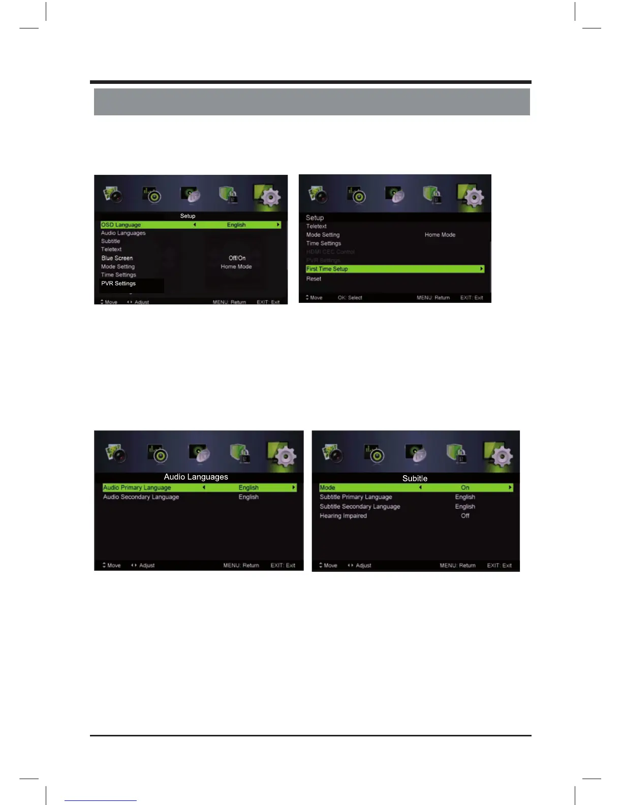 Press / / / button to select the Audio Primary Language and Audio Secondary Language.