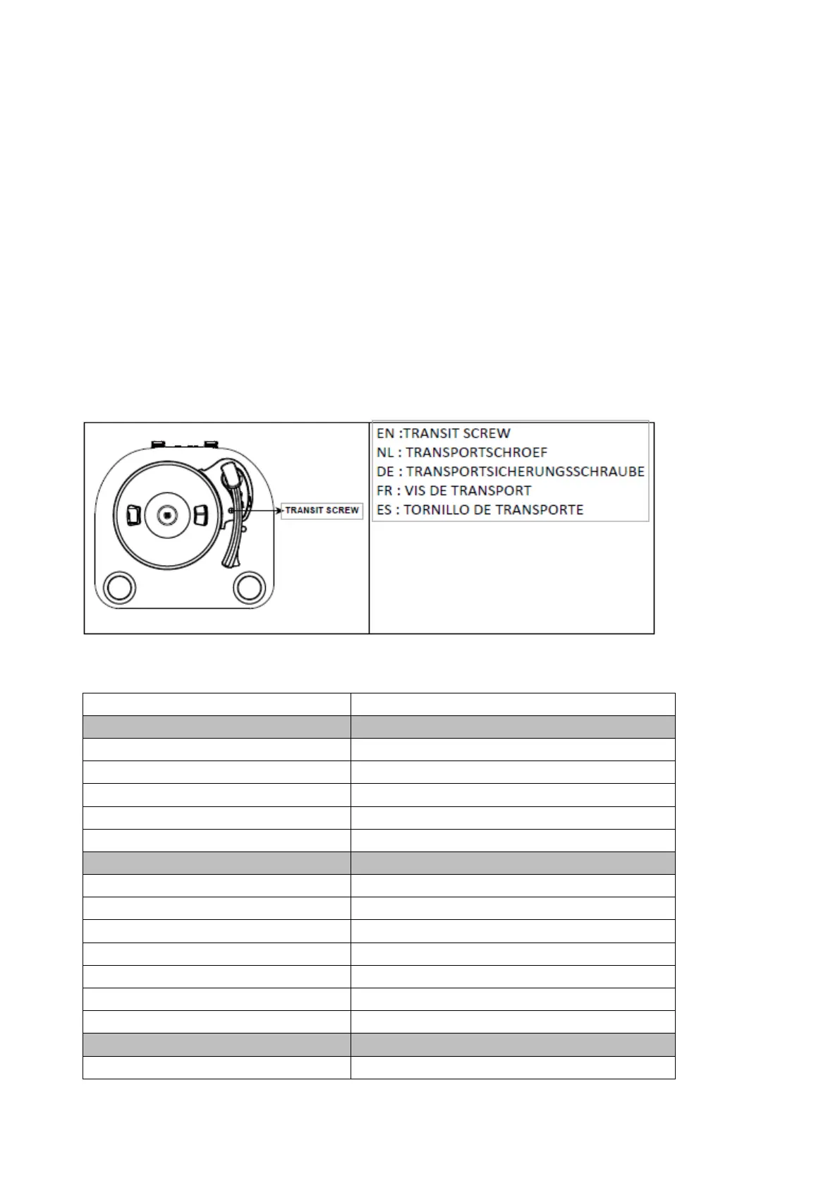 clockwise. This will allow the turntable to “float”. During transportation, make sure to tighten this transit screw by