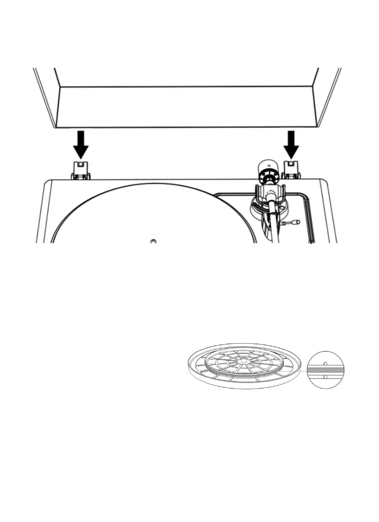Insert the hinge pockets of the lid onto the hinges of the turntable.