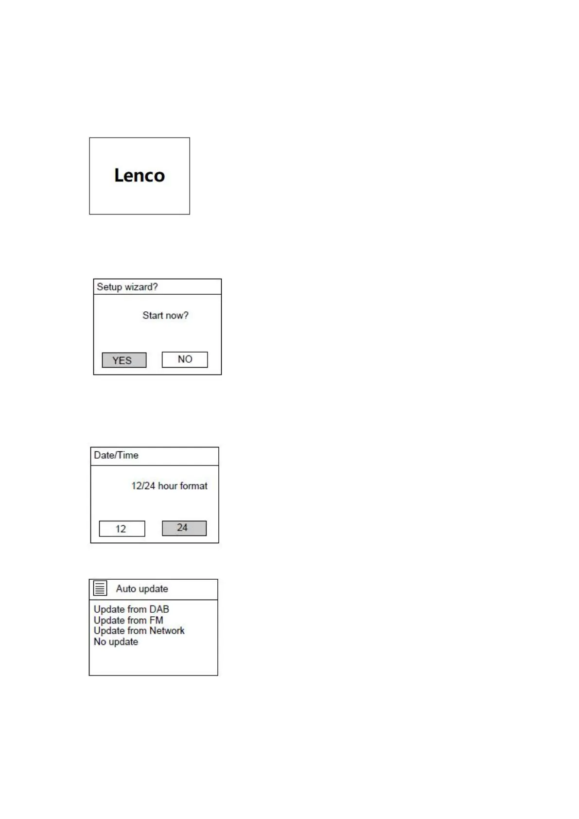 Adapter into the wall outlet. The display will show the Lenco logo as below