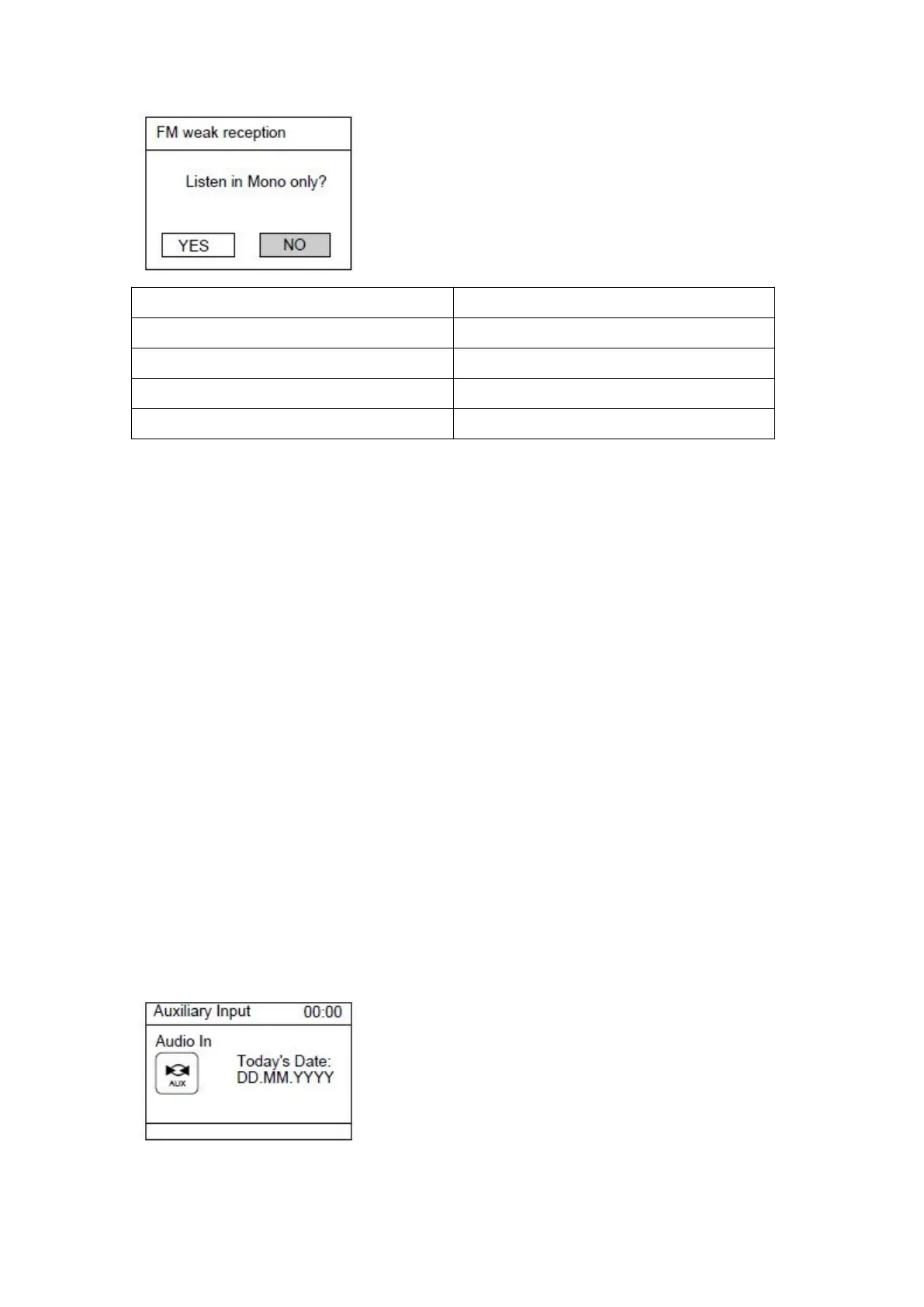 Wenn Sie im Hauptmenü „AUX“ (AUX) ausgewählt haben, dann erscheint die nachstehende