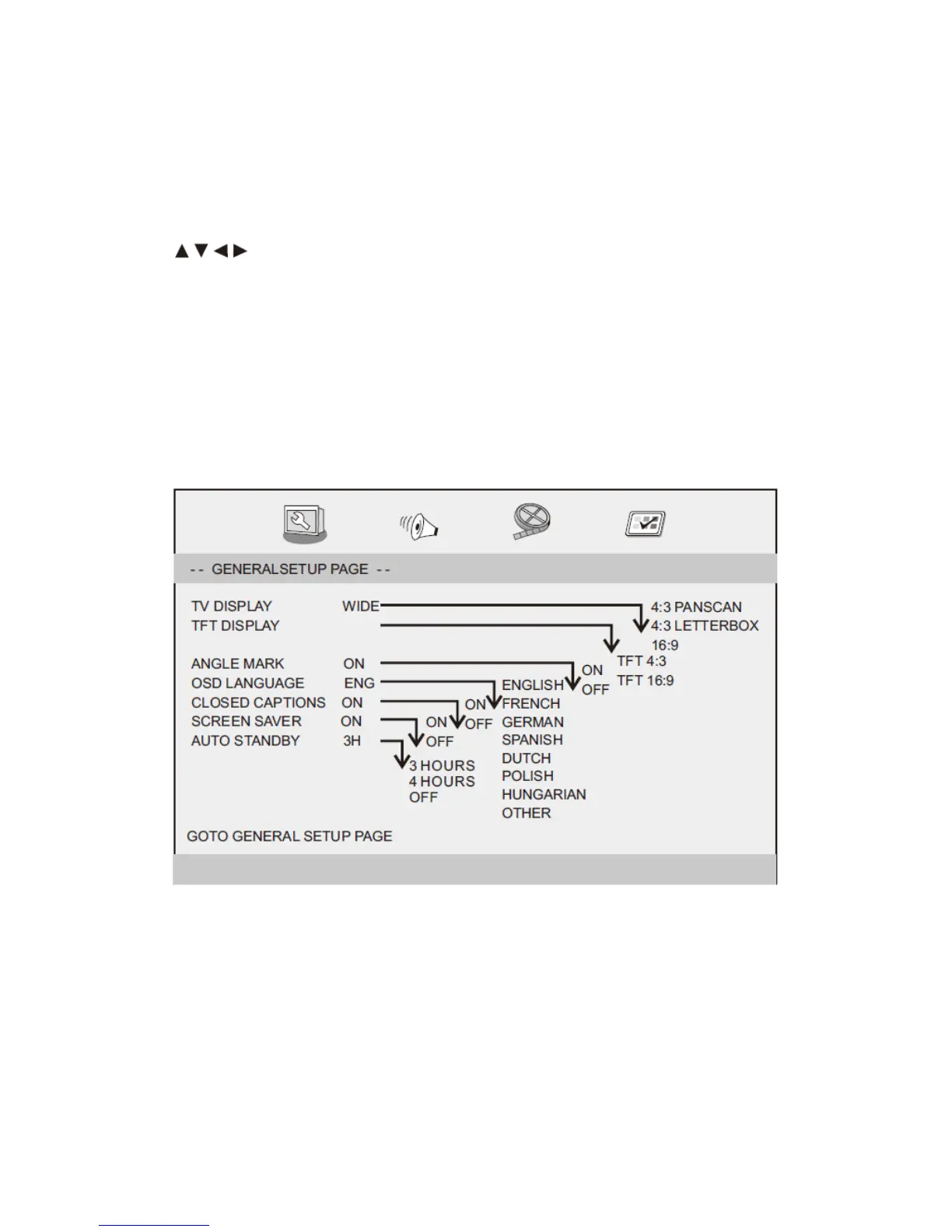 GENERAL (GÉNÉRAL) : affiche la page menu GENERAL (GÉNÉRAL).