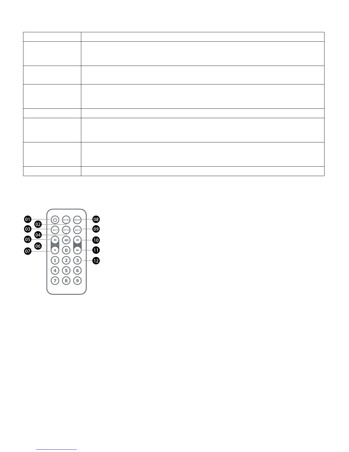 08. Mode: Cycle through the audio source/modes: DAB, FM, BT, Aux in.