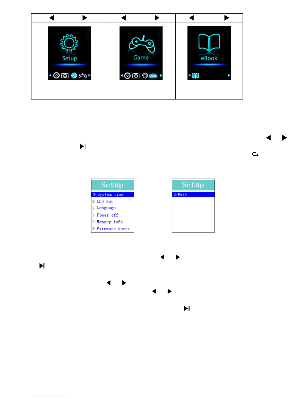 • To go into setup menu, from main menu, choose “Setup” by using /