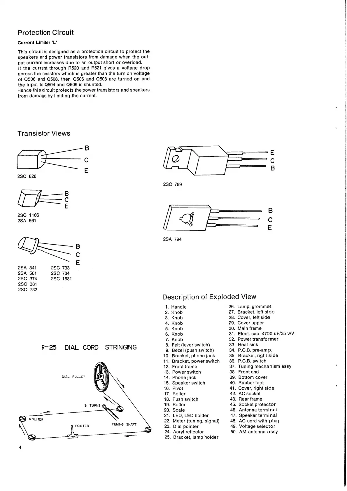 LENCO R25 - Protection Circuit; Transistor Views; Dial Cord Stringing; Description of Exploded View