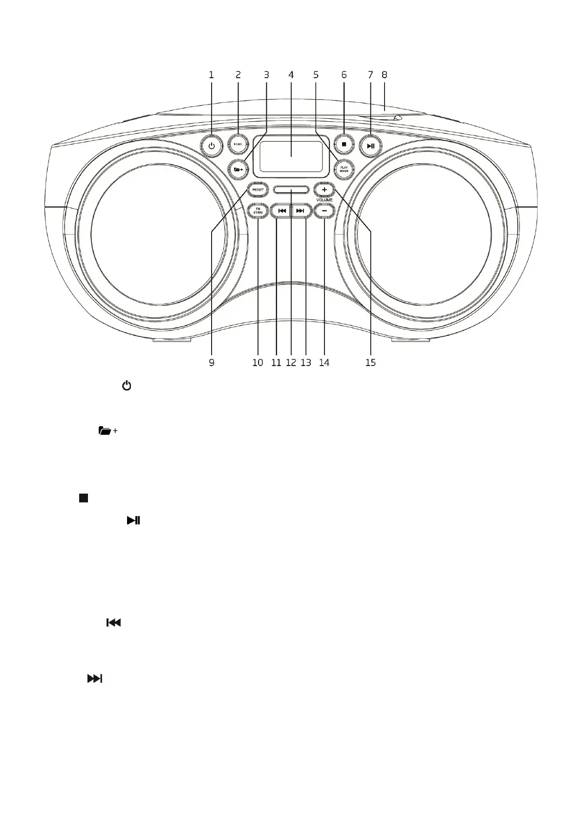CD/USB : Appuyez dessus pour mettre la lecture en pause ou bien reprendre la lecture.