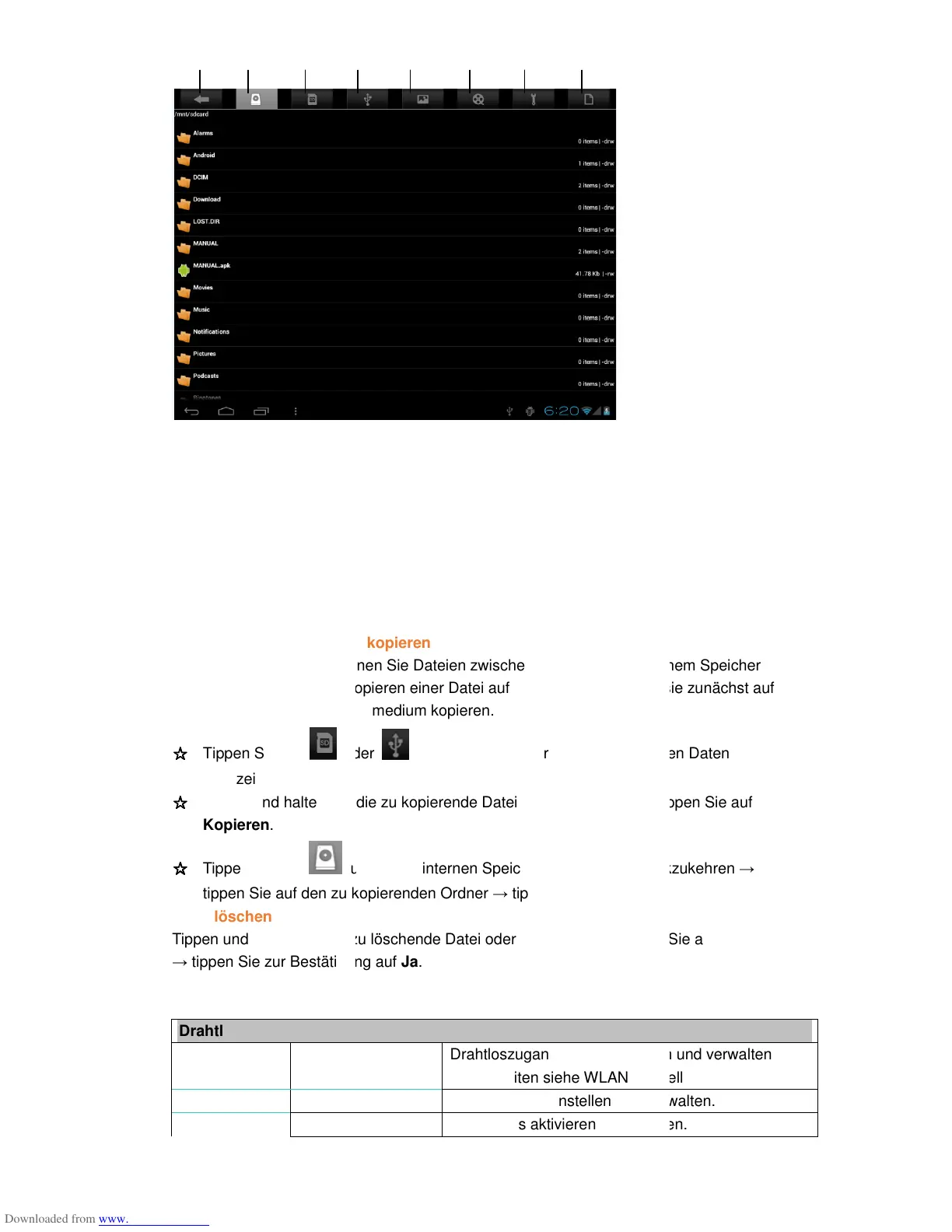 Mit dem Dateimanager können Sie Dateien zwischen externem und internem Speicher