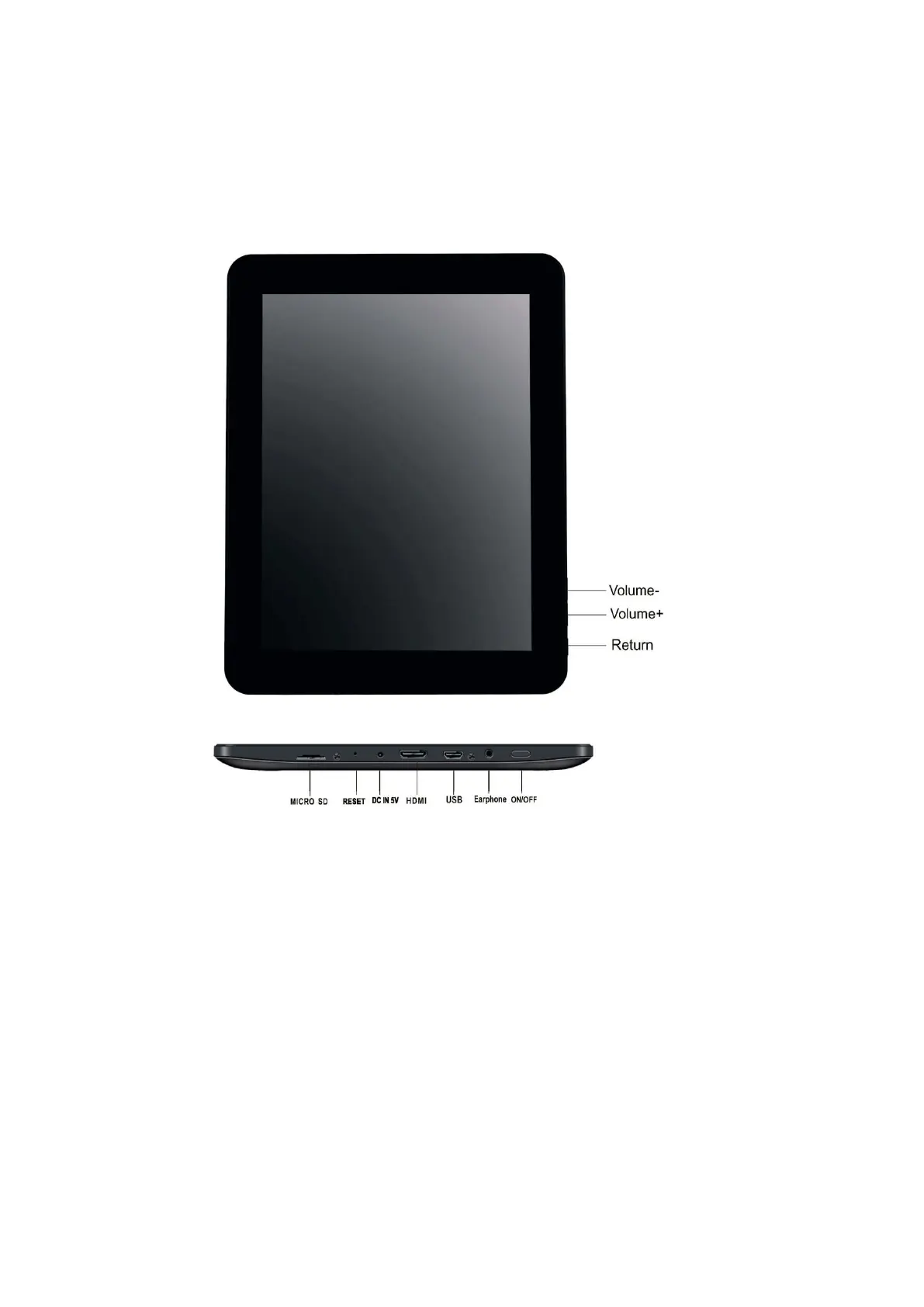 Reset button: Press this button if the tablet does not respond. Use a thin object like