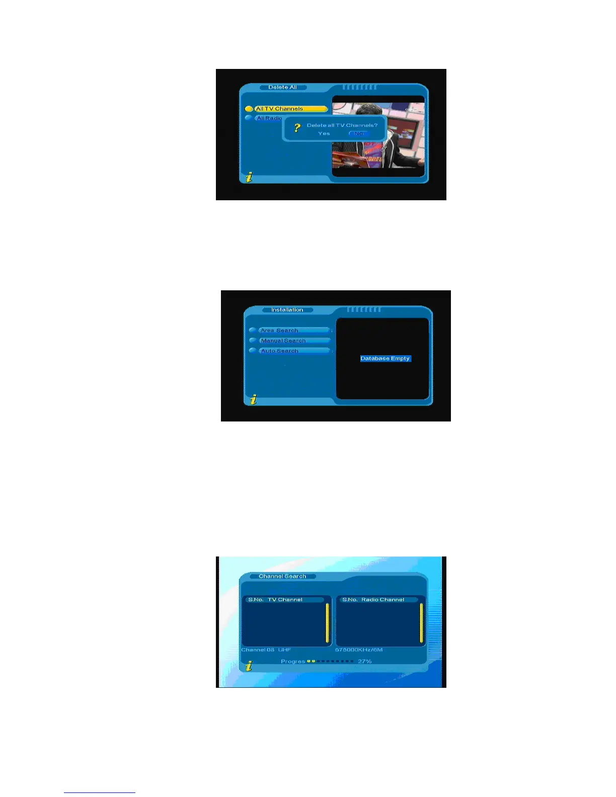Une fois dans la page Recherche automatique, le système recherche les chaînes de télévision selon le
