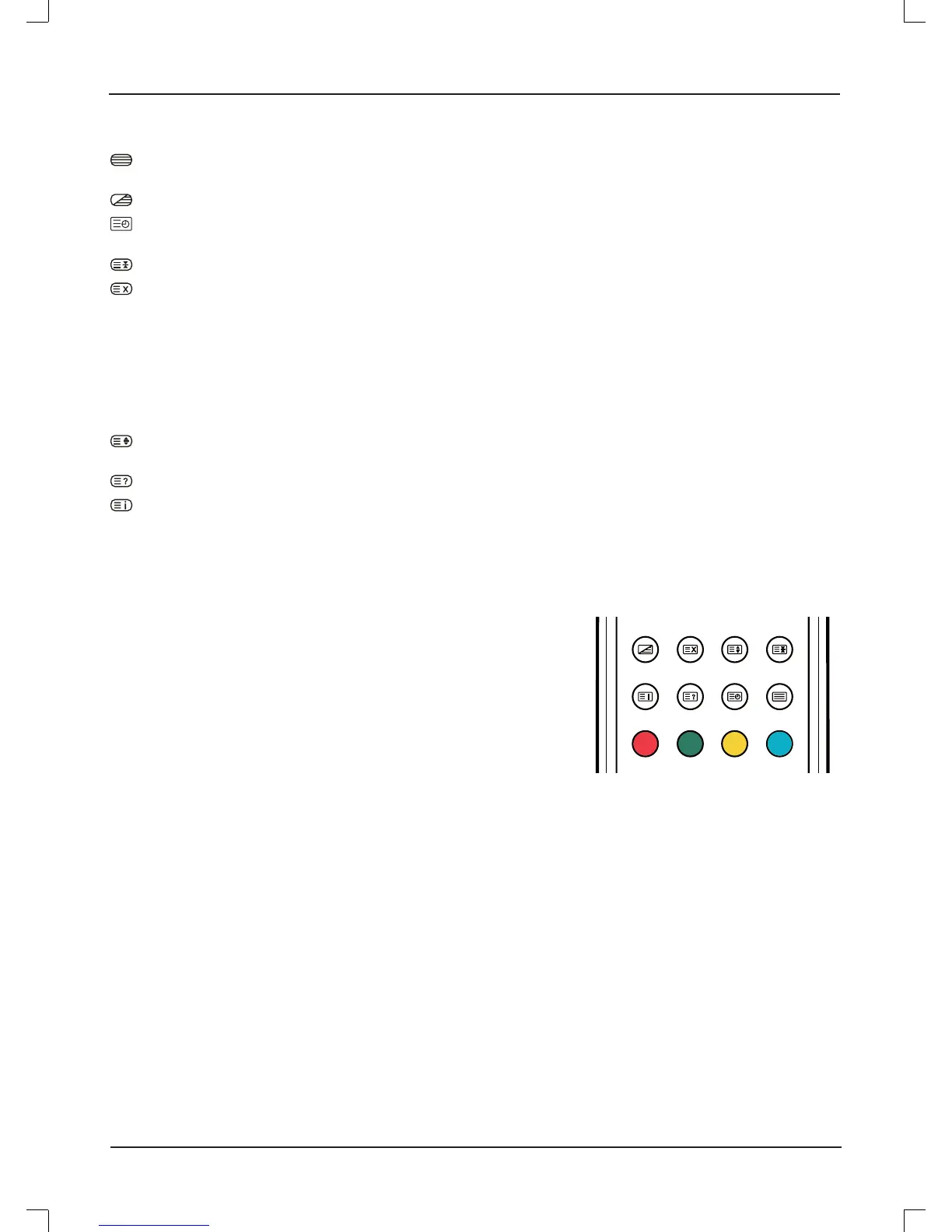 The RED, GREEN, YELLOW & CYAN buttons are used for quick access to color coded pages transmitted by FAST TEXT