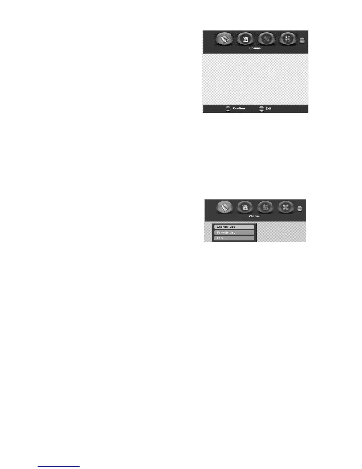 Menüpunkte: Kanalliste (Channel List), Favoritenliste