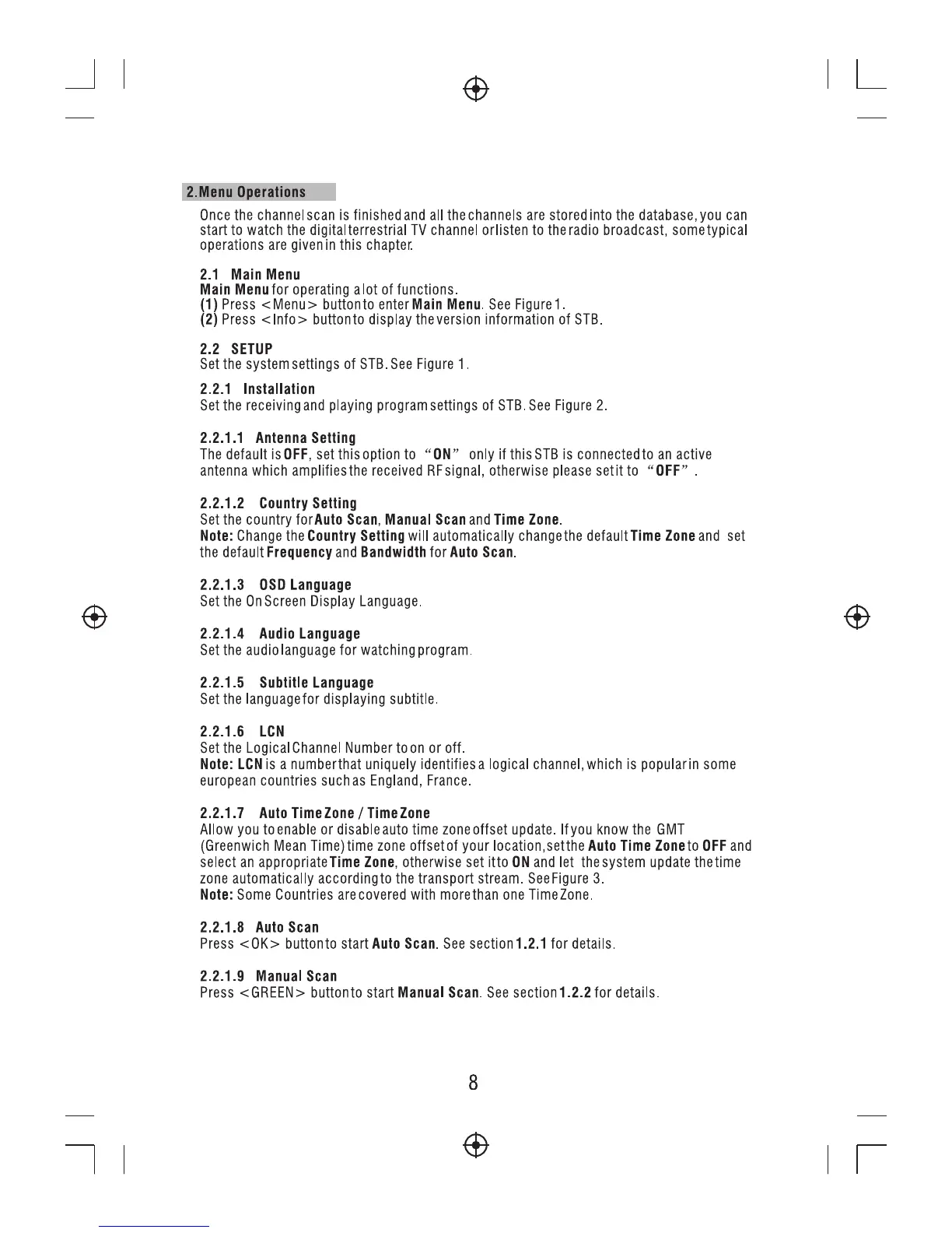 LENCO TFT-725 - Menu Operations; Main Menu; SETUP; Installation