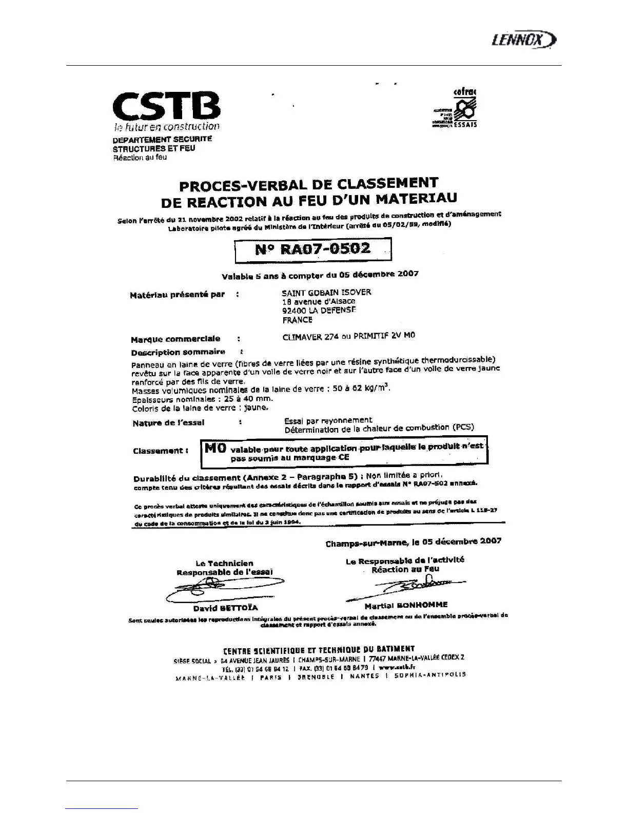 CERTIFICATES CLIMAVER 274