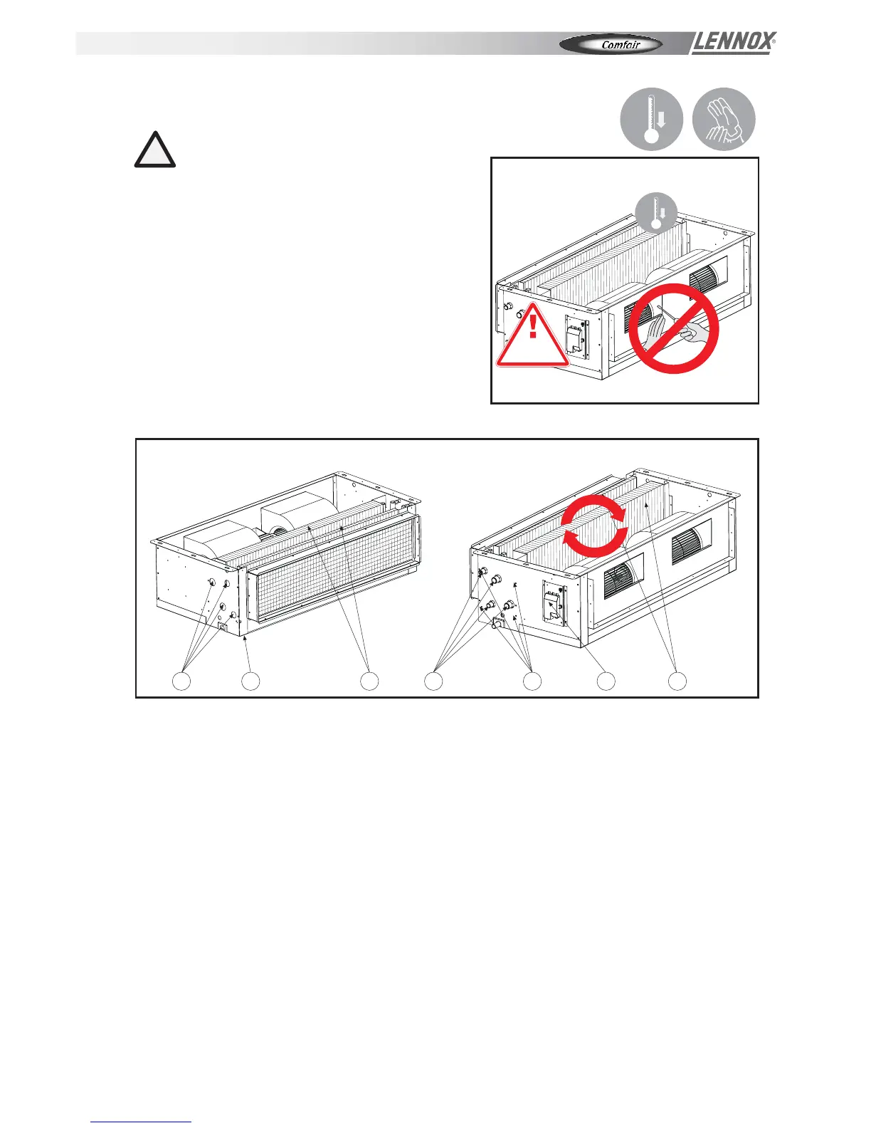 connecting pipes may become very hot (80°C). Wait for the exchanger