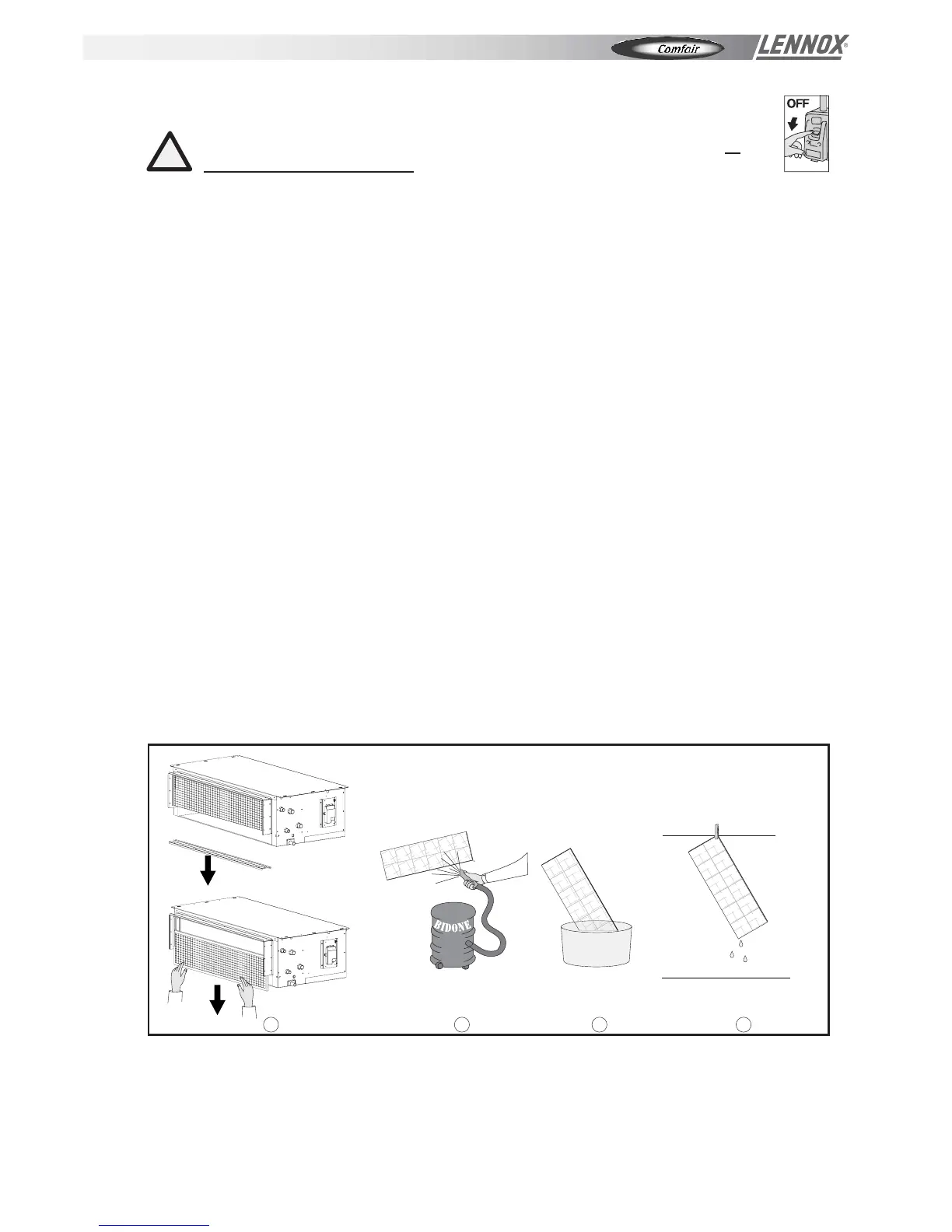 The filter should be cleaned periodically to keep its filtering properties and the airflow to the fan unchanged.
