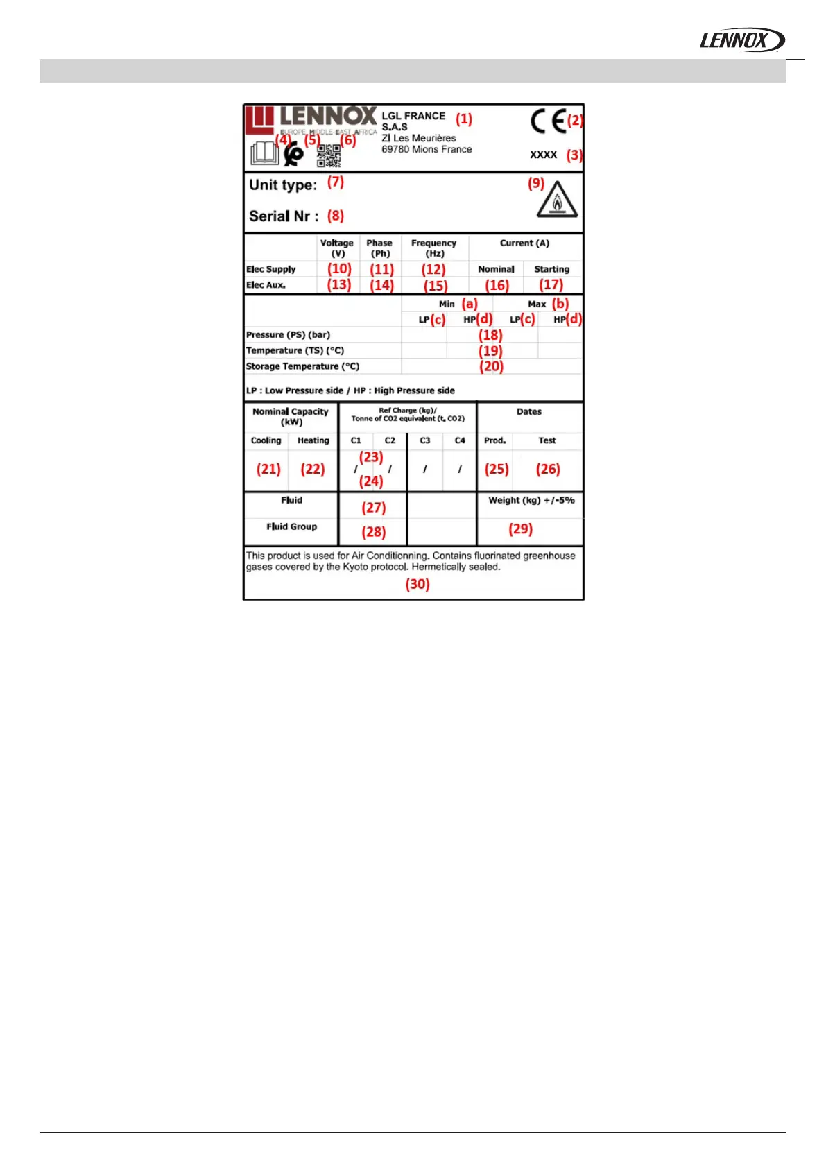 (30) Message: “This product is used for Air Conditioning. Contains uorinated greenhouse gases covered by the Kyoto Protocol.