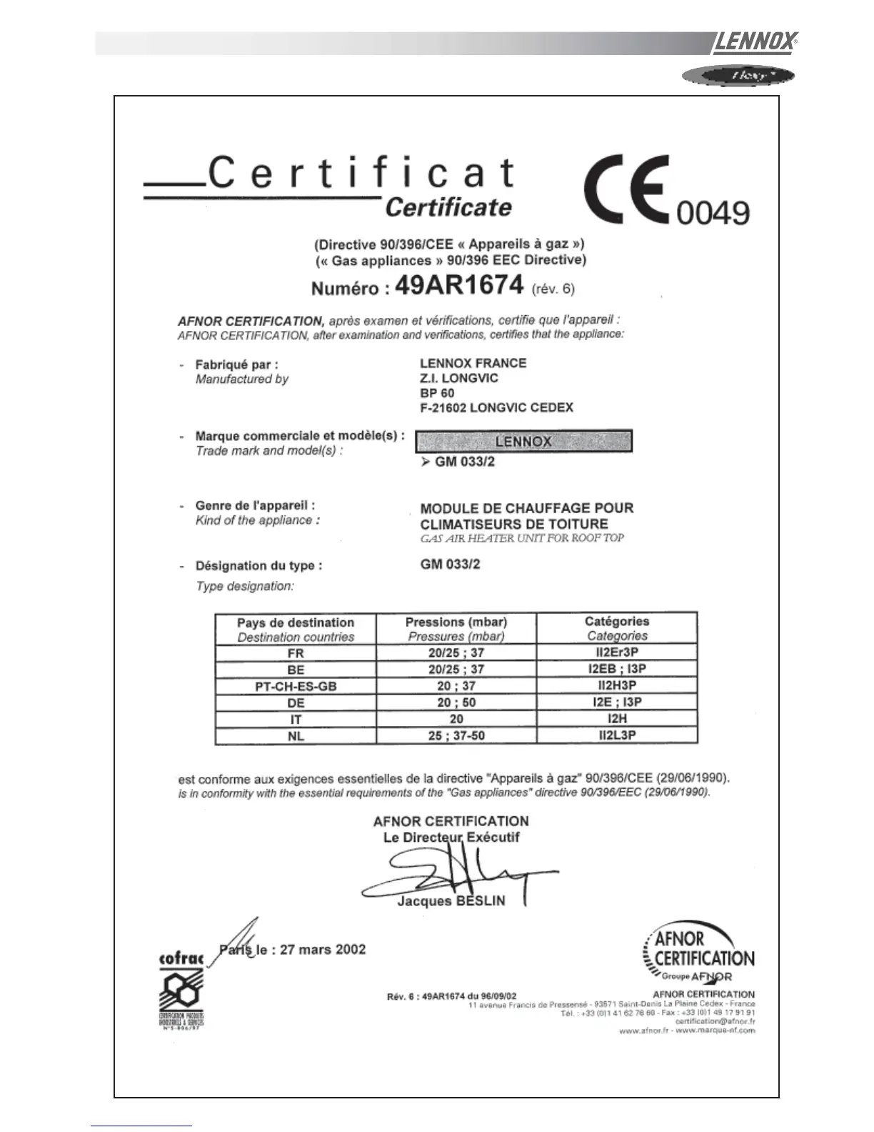 33 kW GAS BURNER CE CERTIFICATION OF CONFORMITY