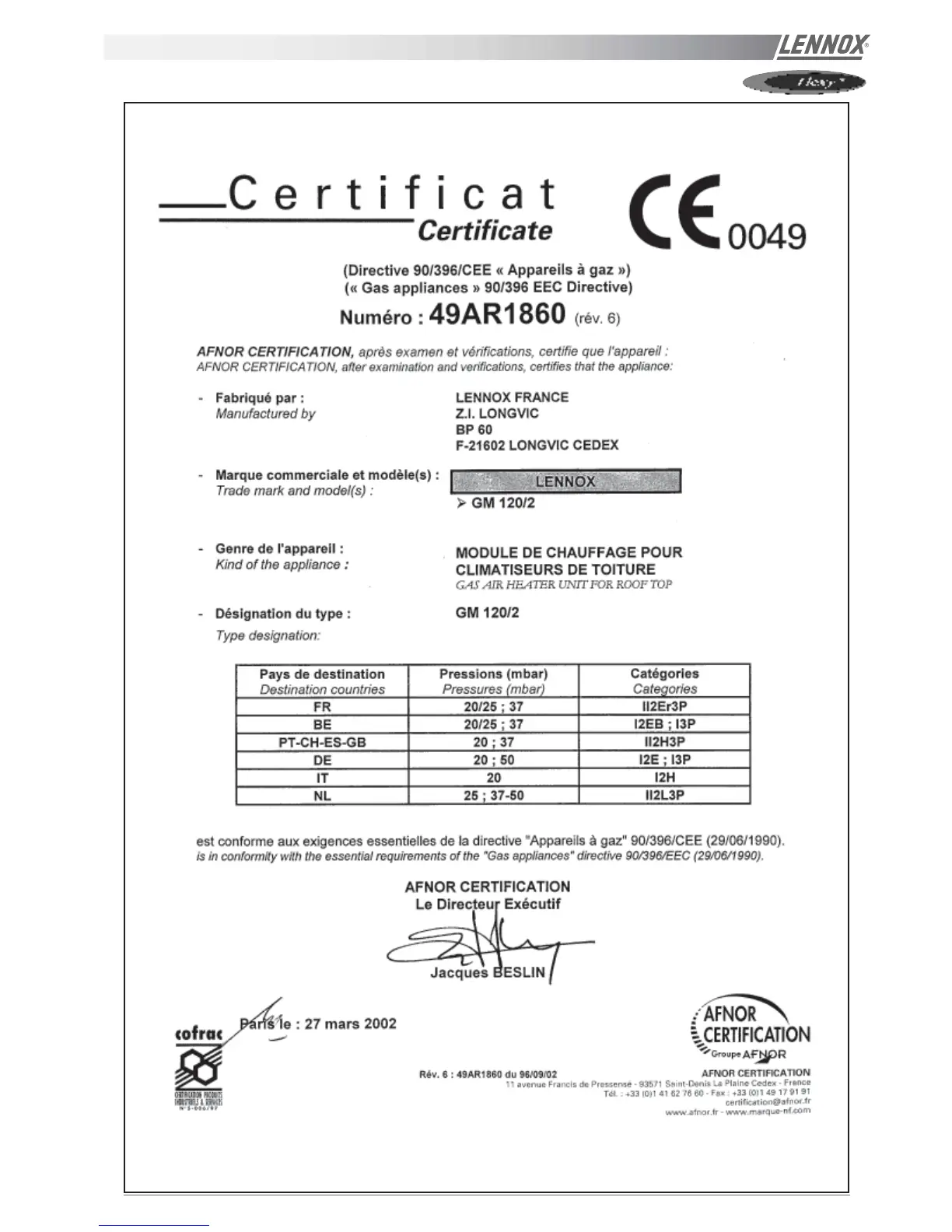 120 kW GAS BURNER CE CERTIFICATION OF CONFORMITY
