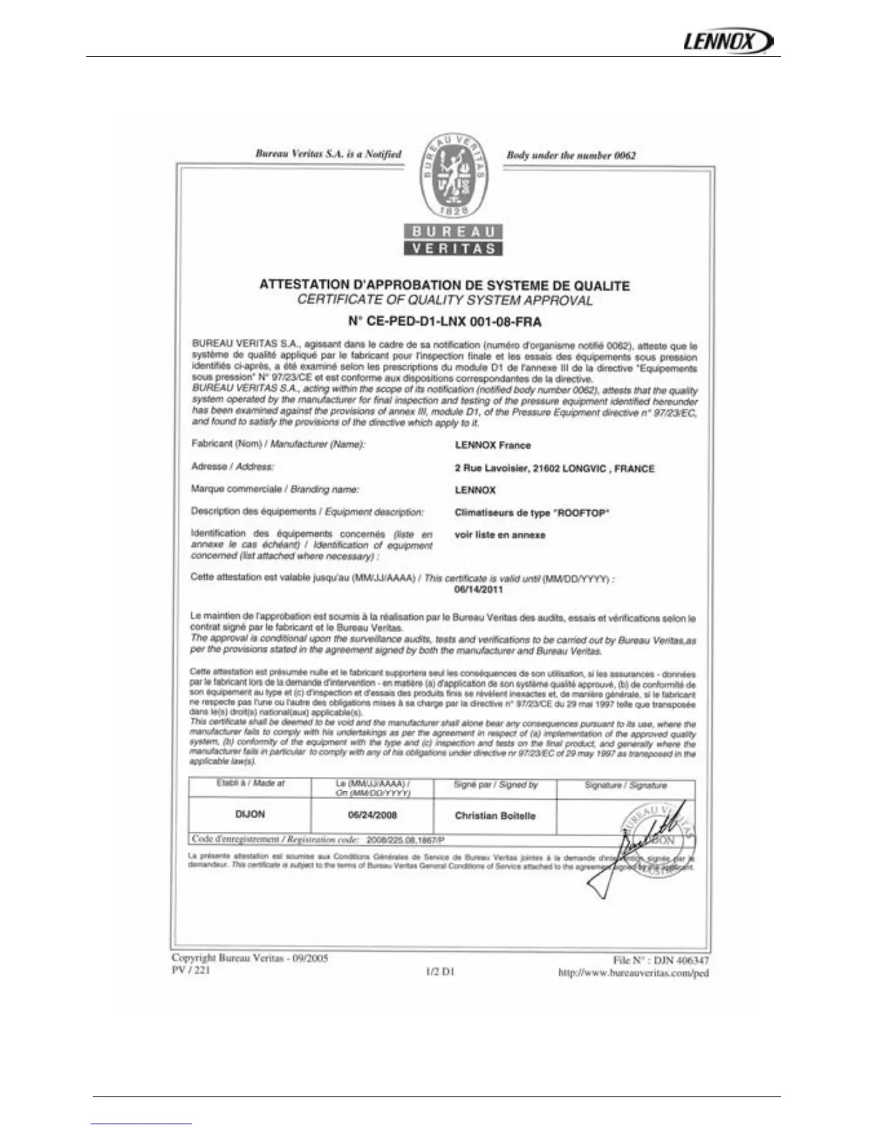 ROOFTOP PED CONFORMITY CERTIFICATE