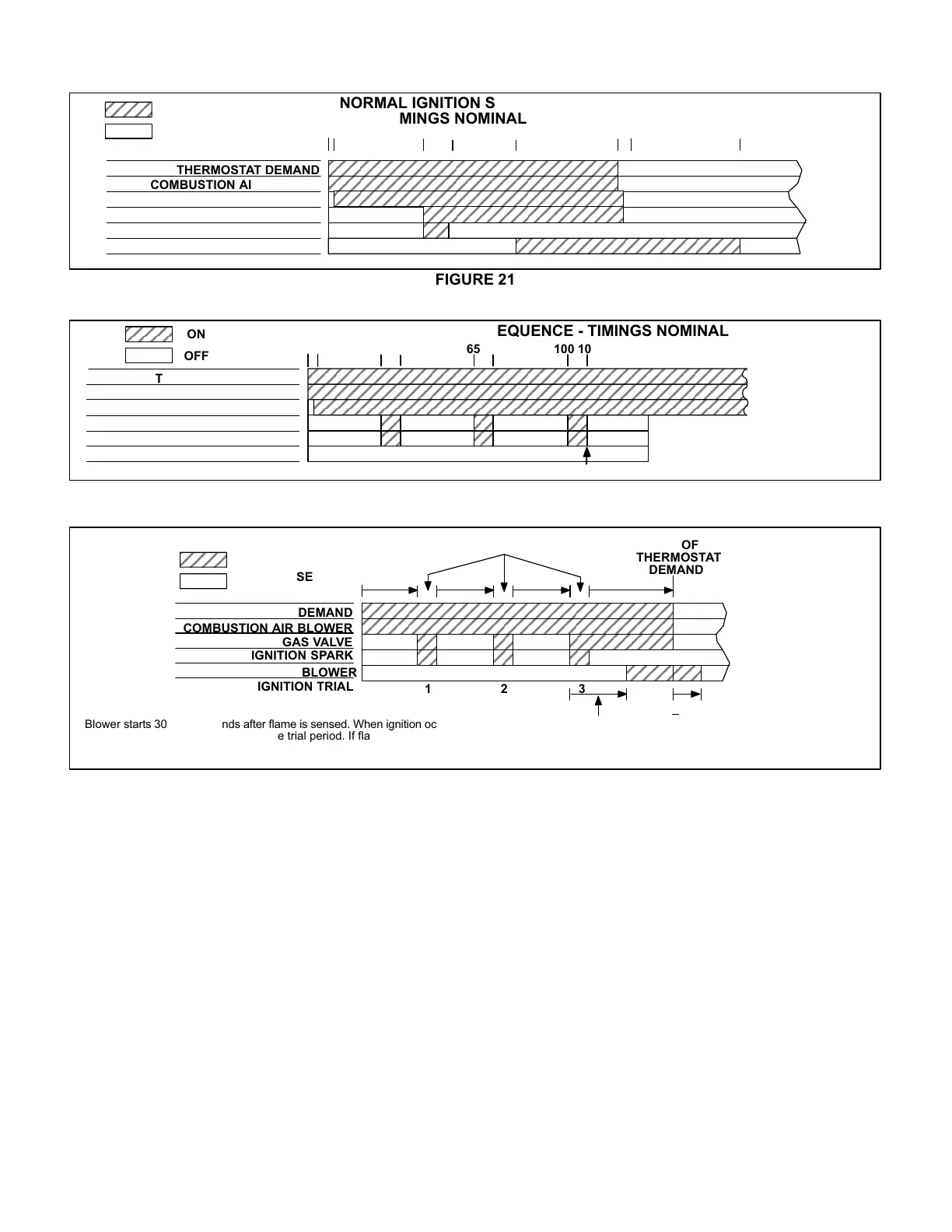 Blower starts 30 to 45 seconds after flame is sensed. When ignition occurs on any trial, heating cycle begins. Ignition spark remains on for a total of 6.8 +3.4,