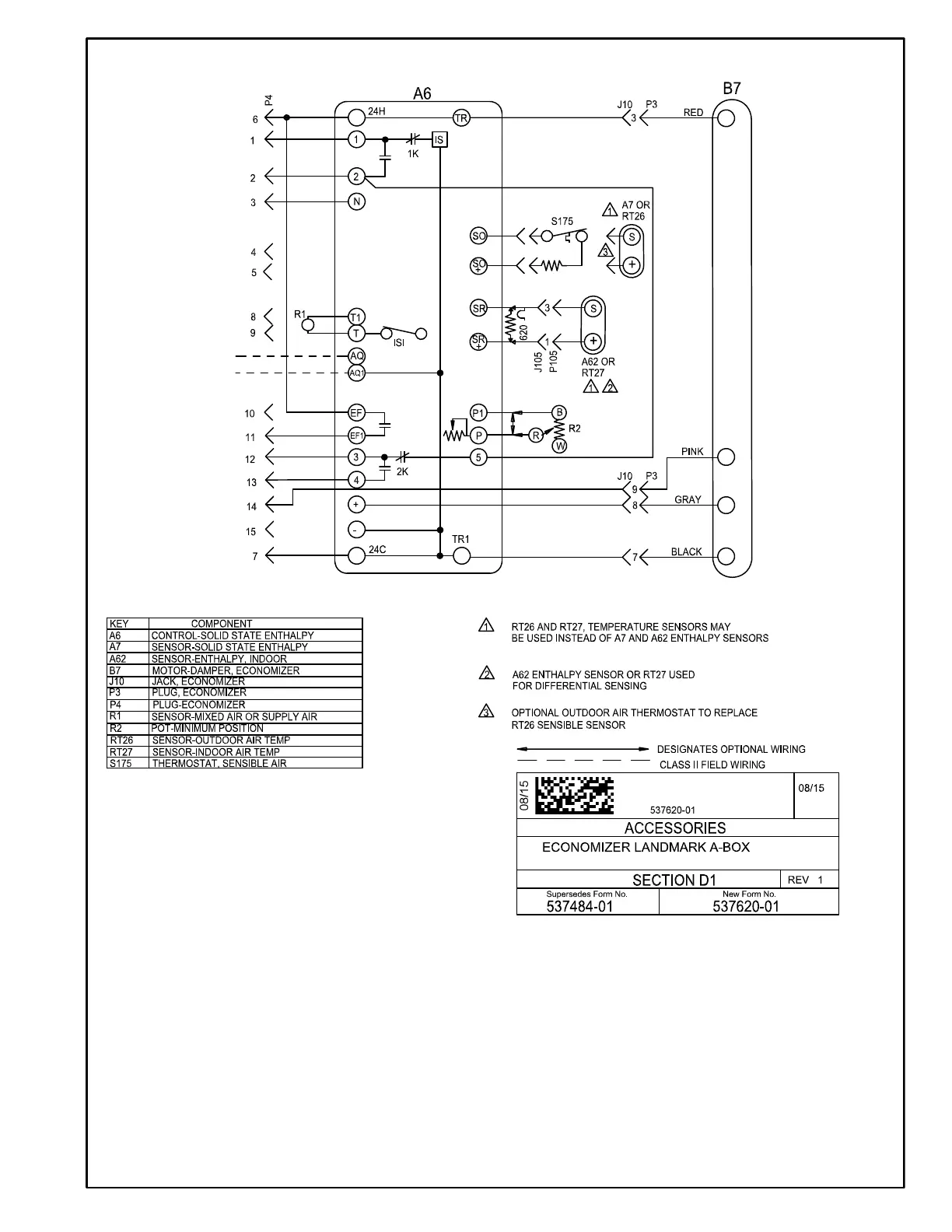 2. Enthalpy sensor A7 and A62 (if differential enthalpy is used) communicates to the economizer control
