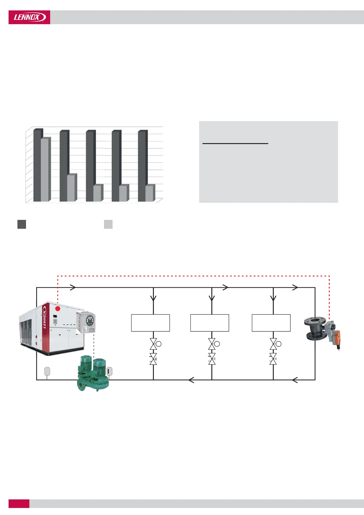 • Through the elimination of the energy normally lost in the water fl ow control valve during unit full-load operation (Variable water