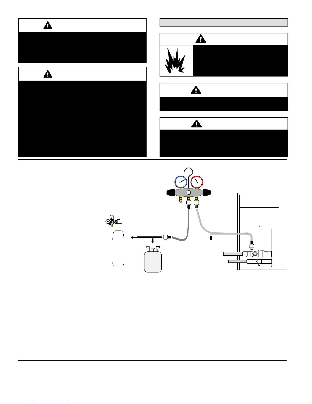 C Connect a cylinder of dry nitrogen with a pressure regulating valve to the center port of the manifold gauge set.