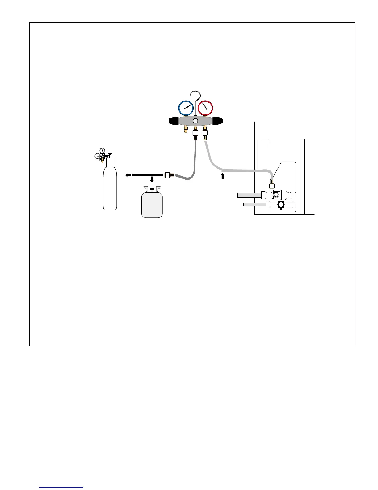 C Connect a cylinder of dry nitrogen with a pressure regulating valve to the center port of the manifold gauge set.