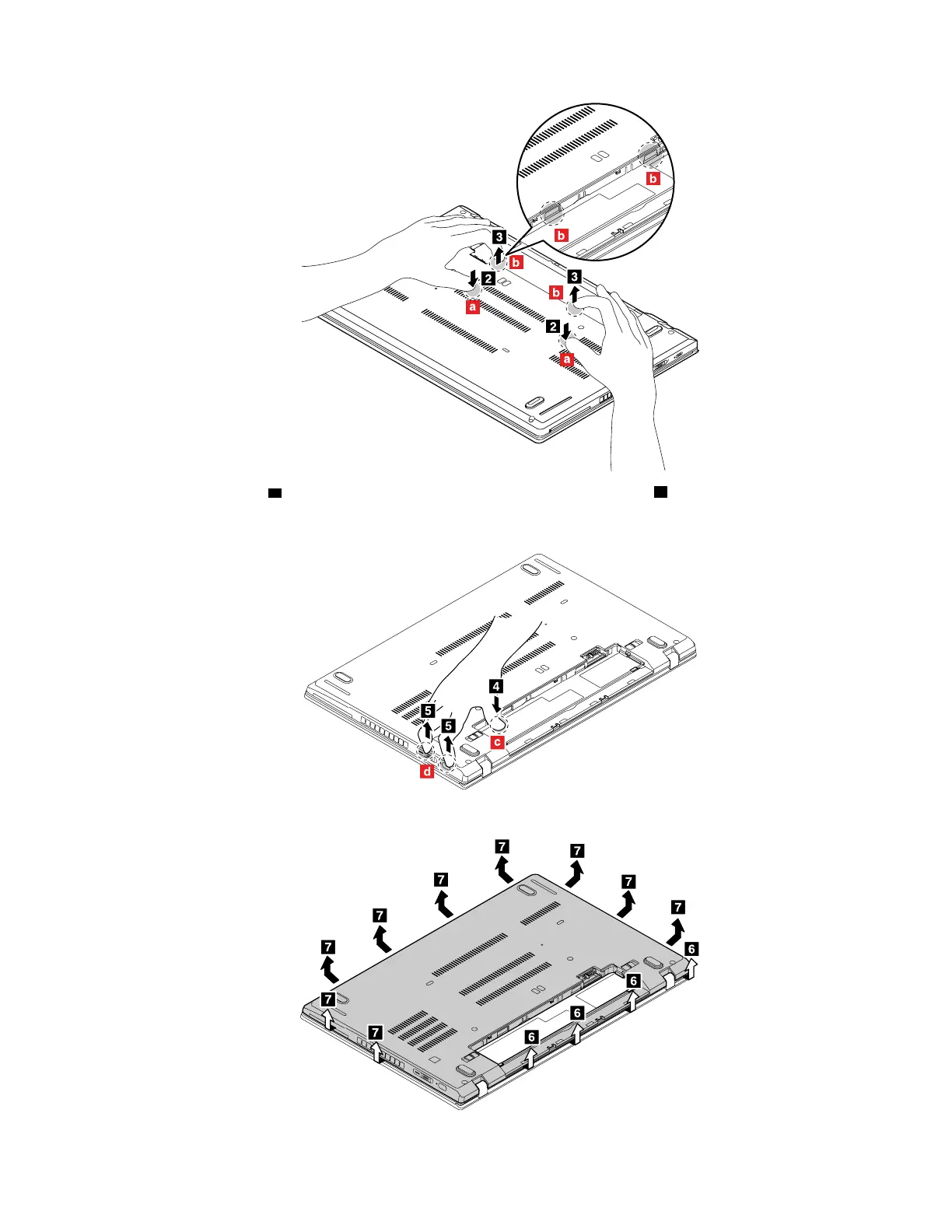 4. Press the location c with your thumb and insert your fingers into the holes d to pivot this area of the