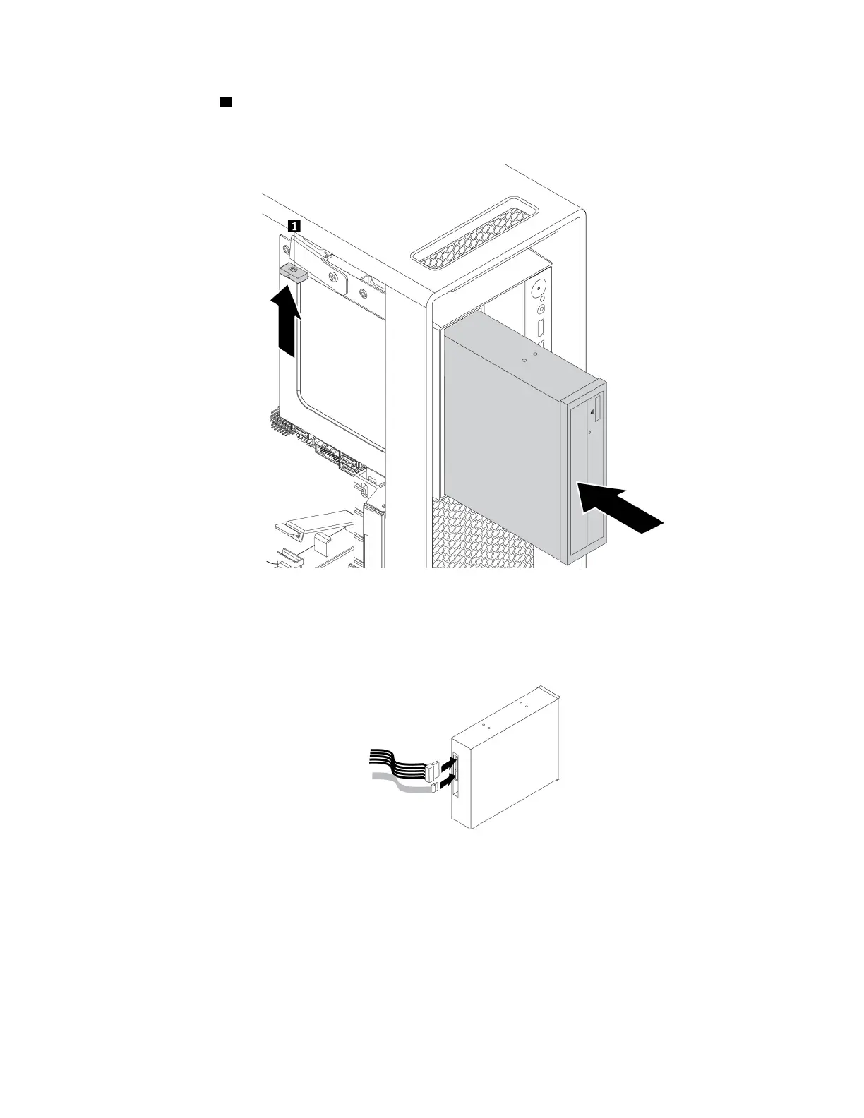 b. Lift the tab 1 upward as shown, and slide the new optical drive halfway into the bay from the front of