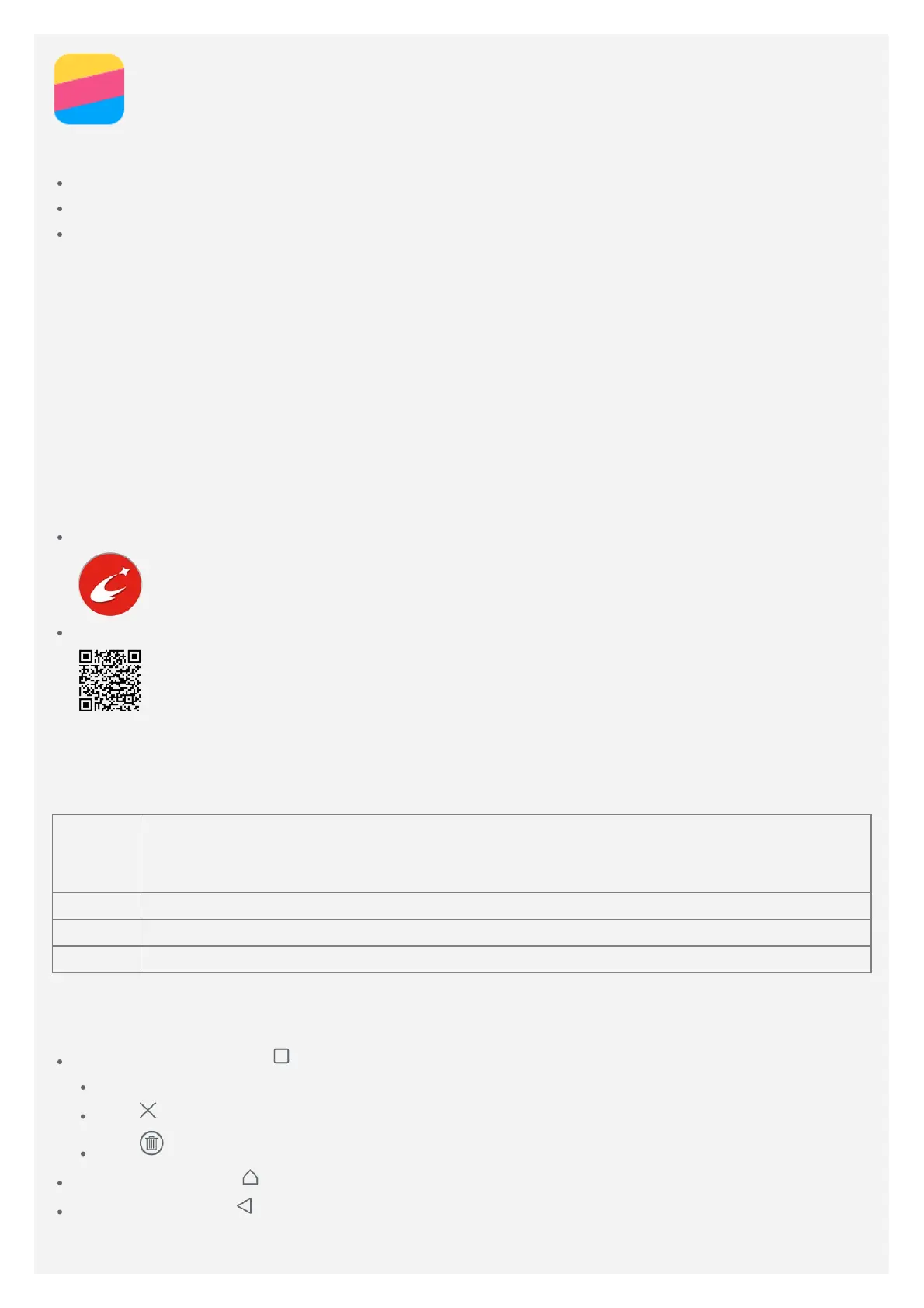 Back button: Tap to return to the previous page or exit the current app.