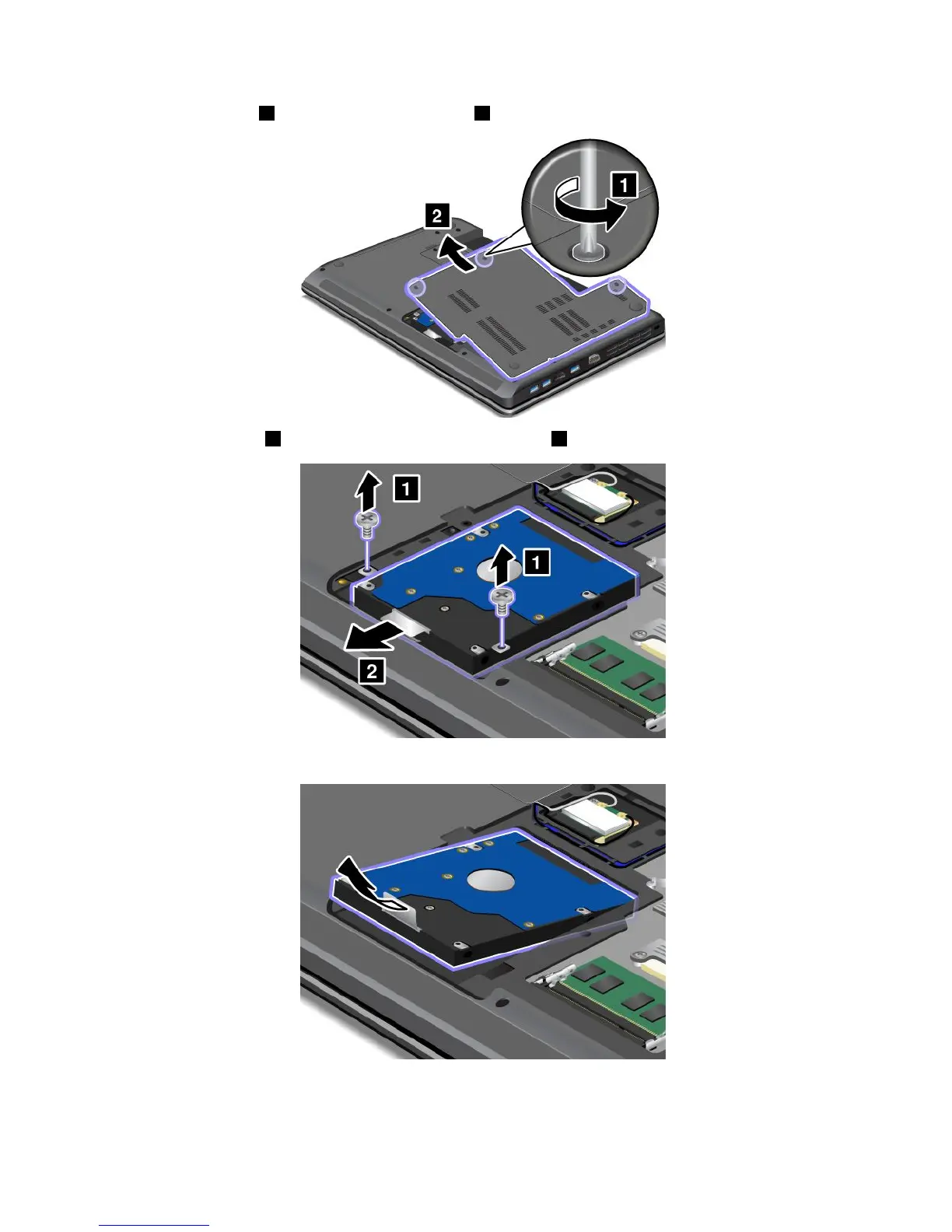 5.Removethescrews1,andthenslidetheharddiskdriveout2.