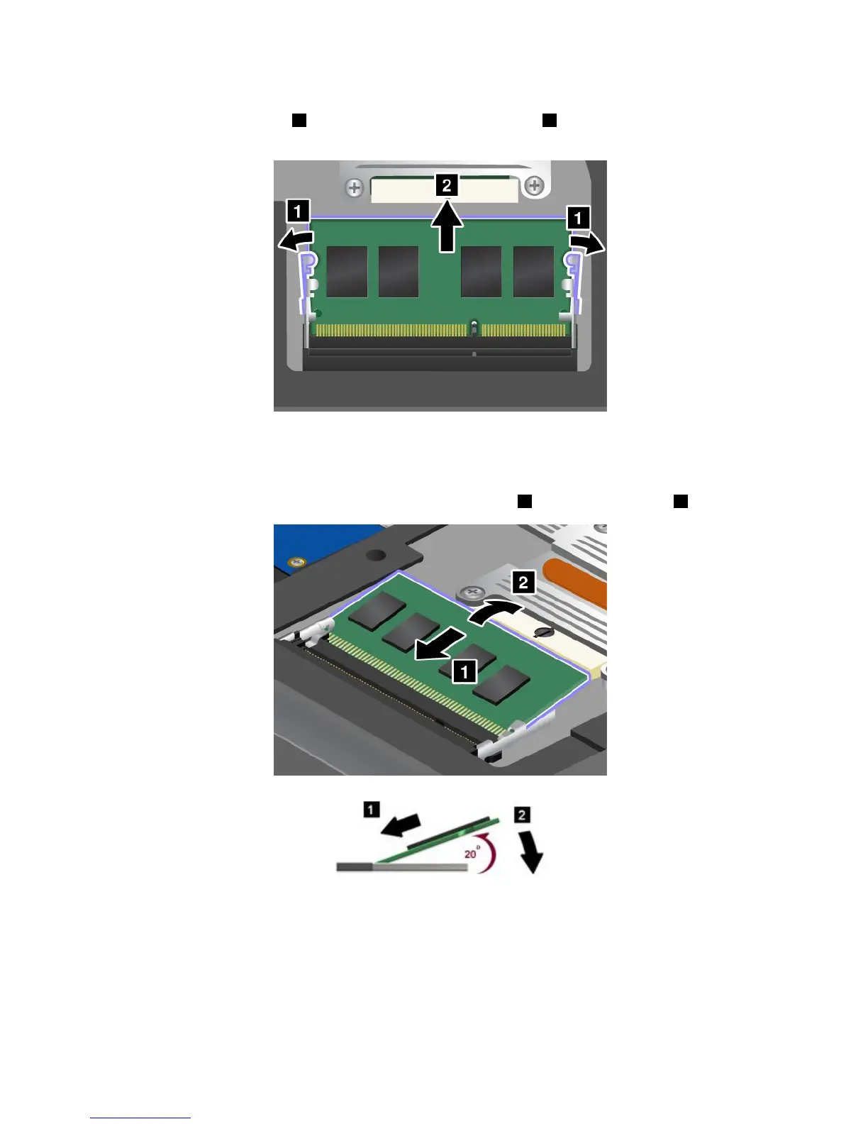 memorymoduleintothesocketatanangleofabout20degrees1;thenpressitinrmly2.