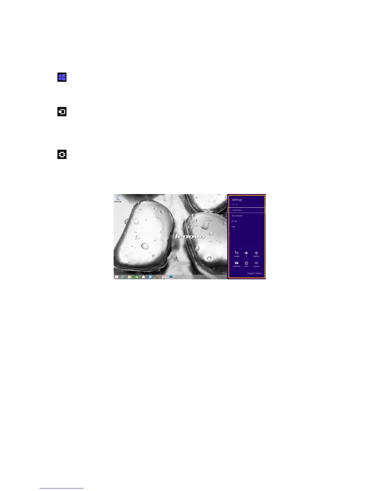 The Settings charm lets you perform basic tasks, such as setting the volume or shutting down