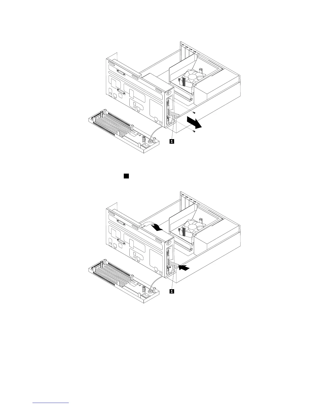 7.Pressthedrivebayassemblyclip1inwardandpivotthedrivebayassemblydownwardasshown.