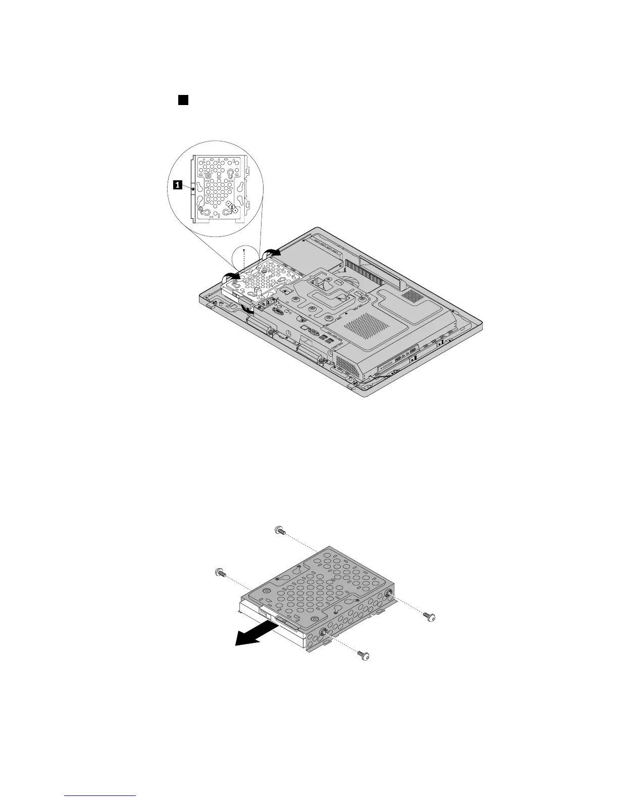6.Removethescrew1,andthenpivotthehard-disk-drivebracketwiththeharddiskdriveasshownto