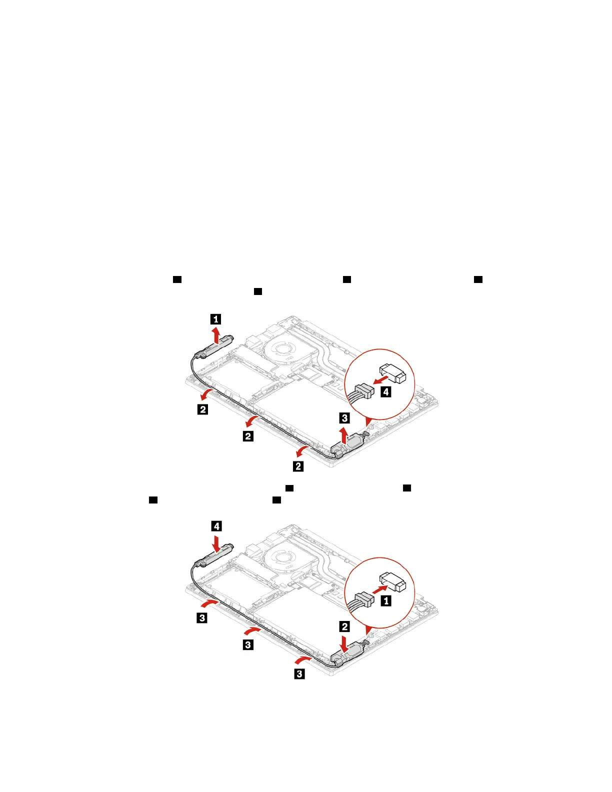 1 first and release the speaker cables 2 . Then, remove the speaker 3 and detach