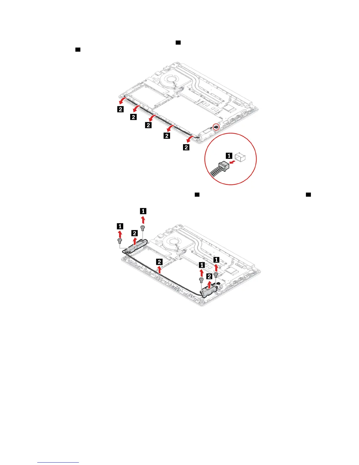6. Remove the screws that secure the speaker assembly 1 , and then remove the speaker assembly 2 .