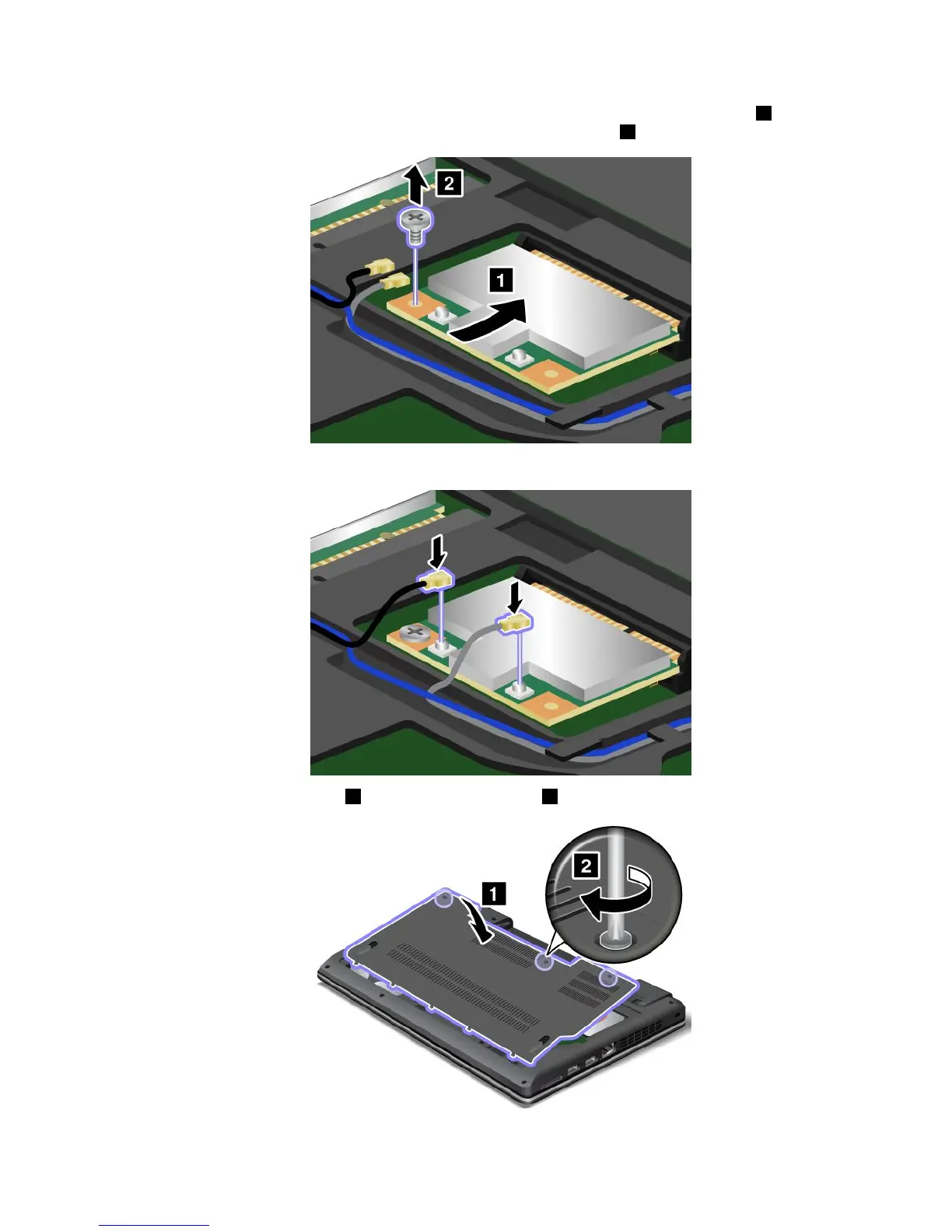 8.ConnecttheantennacablestothenewPCIExpressMiniCardasshowninthedrawing.