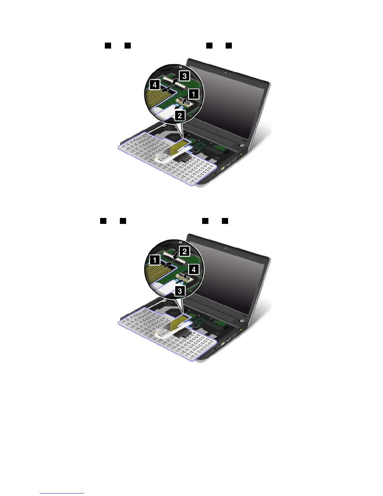 8.Removethecables2and4byippingtheconnectors1and3upwards.Removethekeyboard.