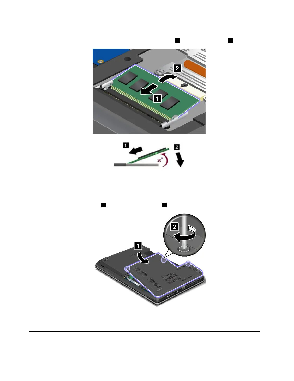 memorymoduleintothesocketatanangleofabout20degrees1;thenpressitinrmly2.
