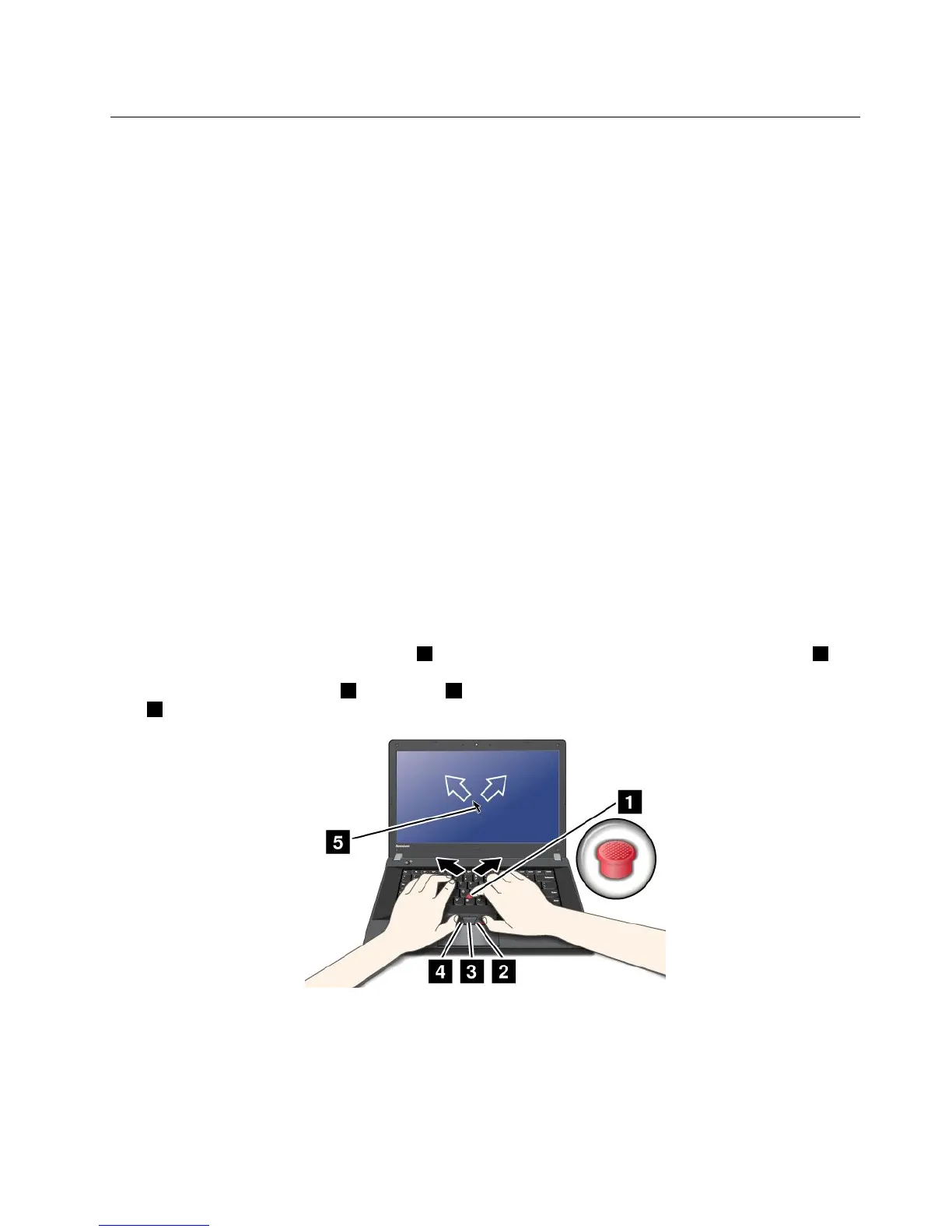 TrackPoint定位设备由键盘上的一个指点杆1和键盘底部的三个点击键组成。要在屏幕上移动指针5,请