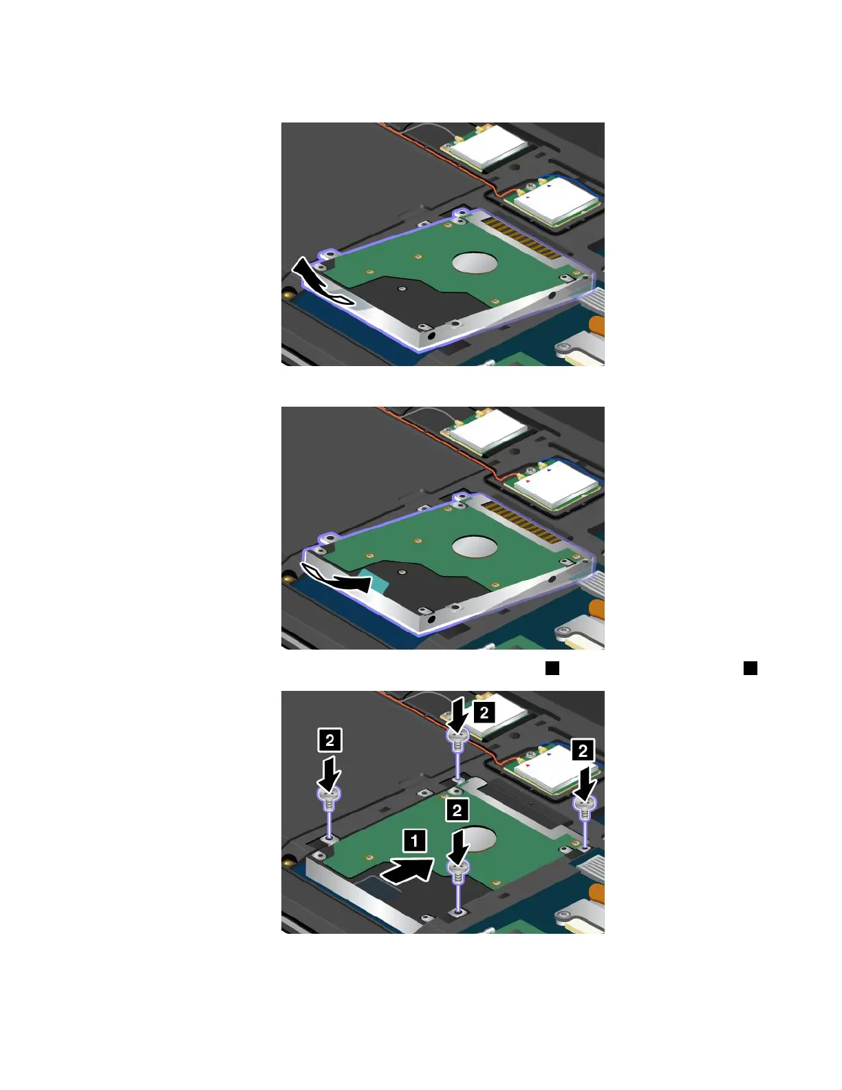 8.Slidetheharddiskdriveorsolid-statedrivermlyintotheconnector1,andthenreinstallthescrews2.
