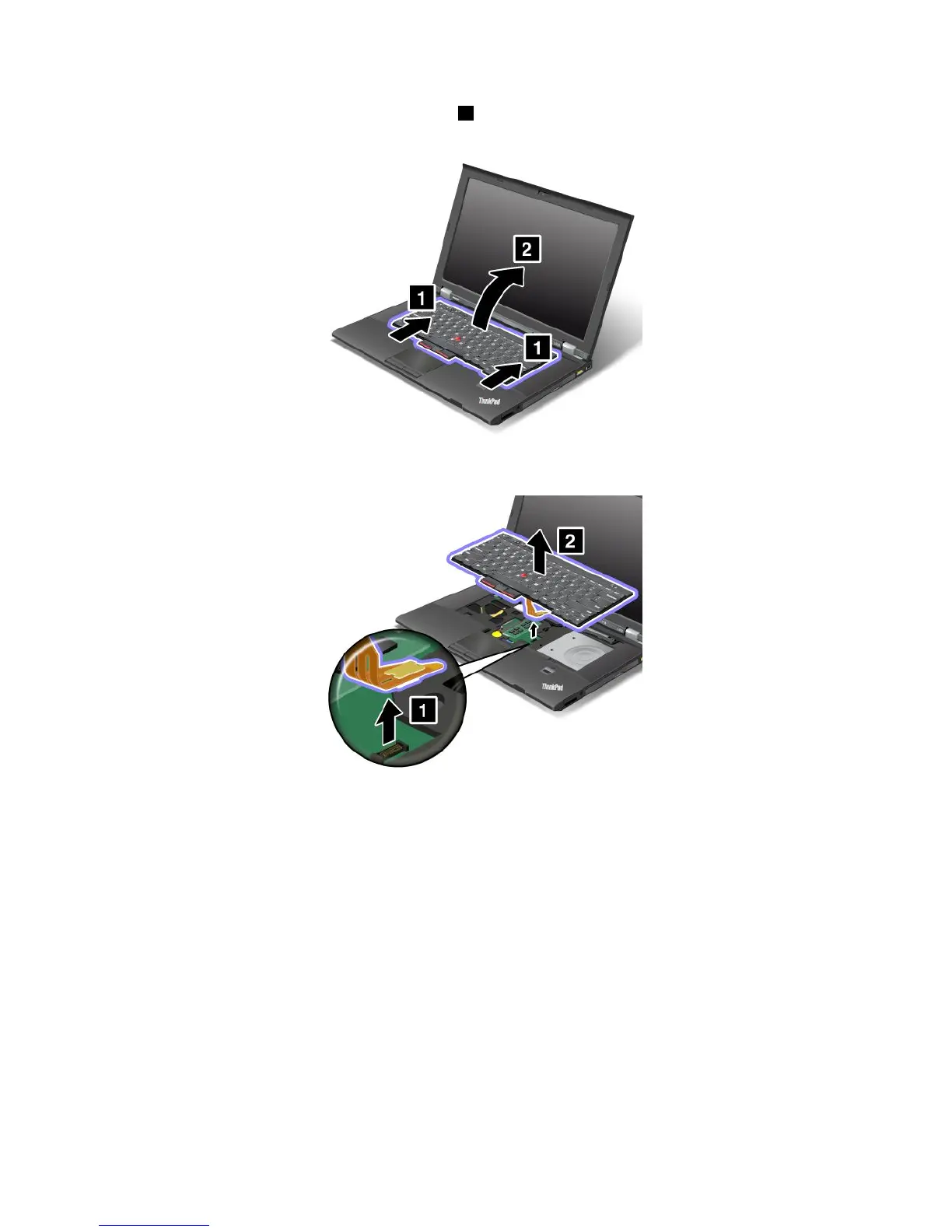 7.Pushhardinthedirectionshownbythearrows 1 tounlatchthefrontsideofthekeyboard.The