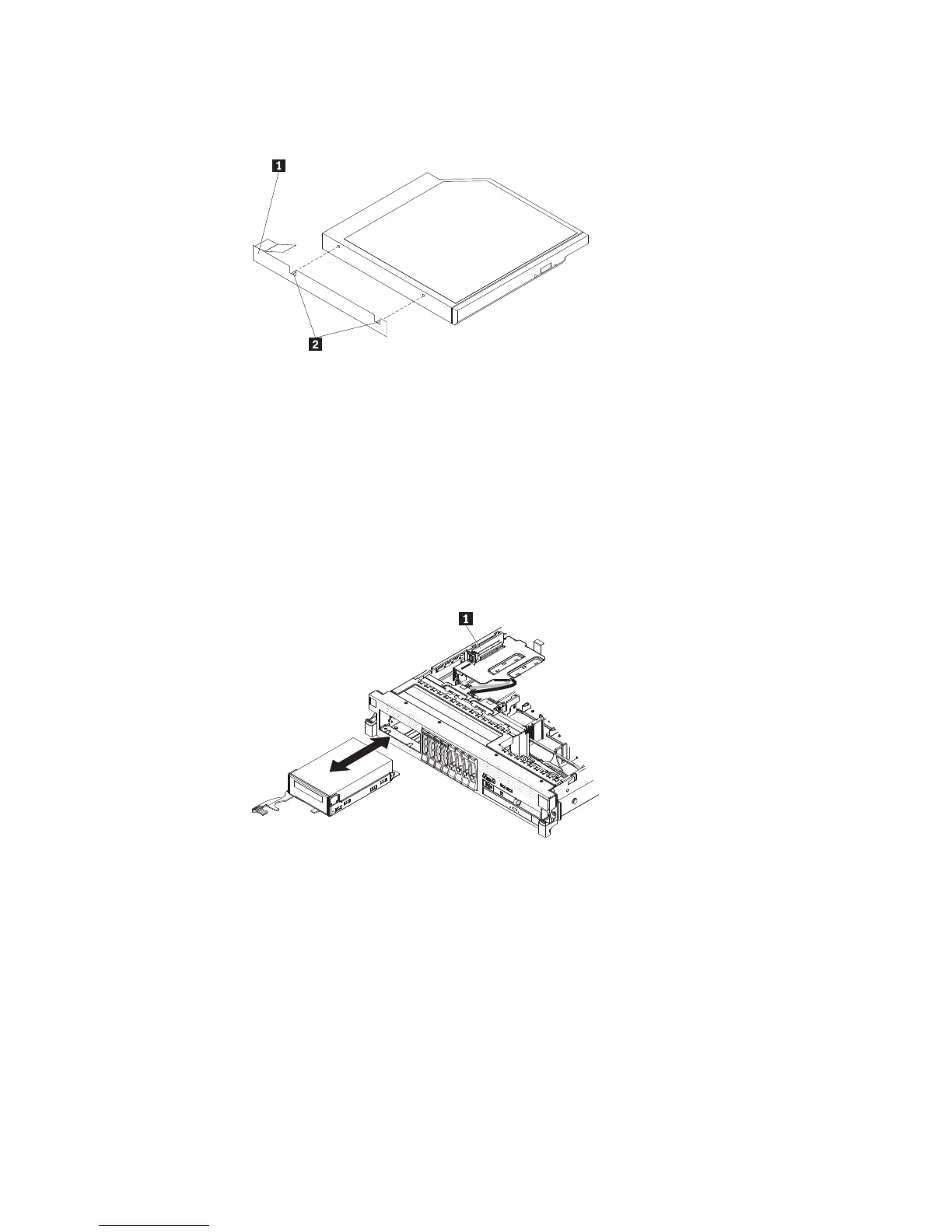 2. Slide the drive into the CD/DVD drive bay (using the alignment pins 2) until