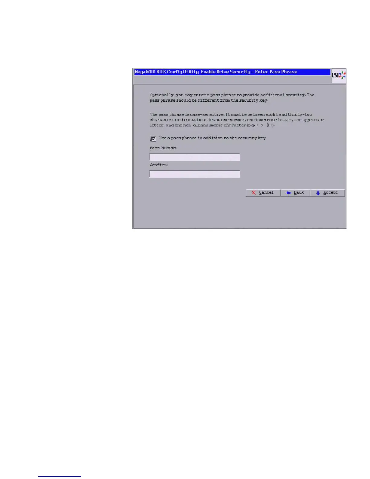 Figure 69: Enable Drive Security – Enter Pass Phrase