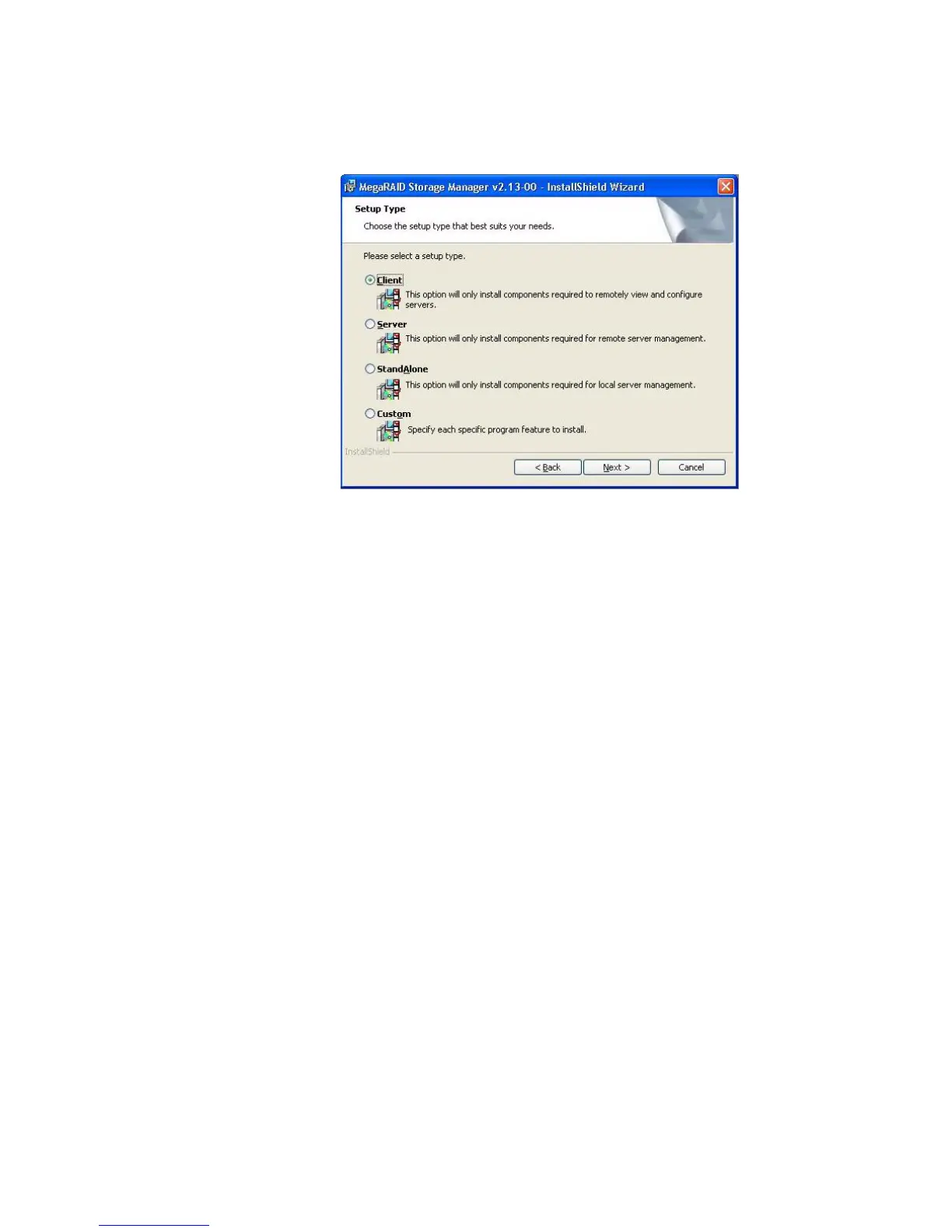 — Select Client if you are installing MegaRAID Storage Manager software on a PC