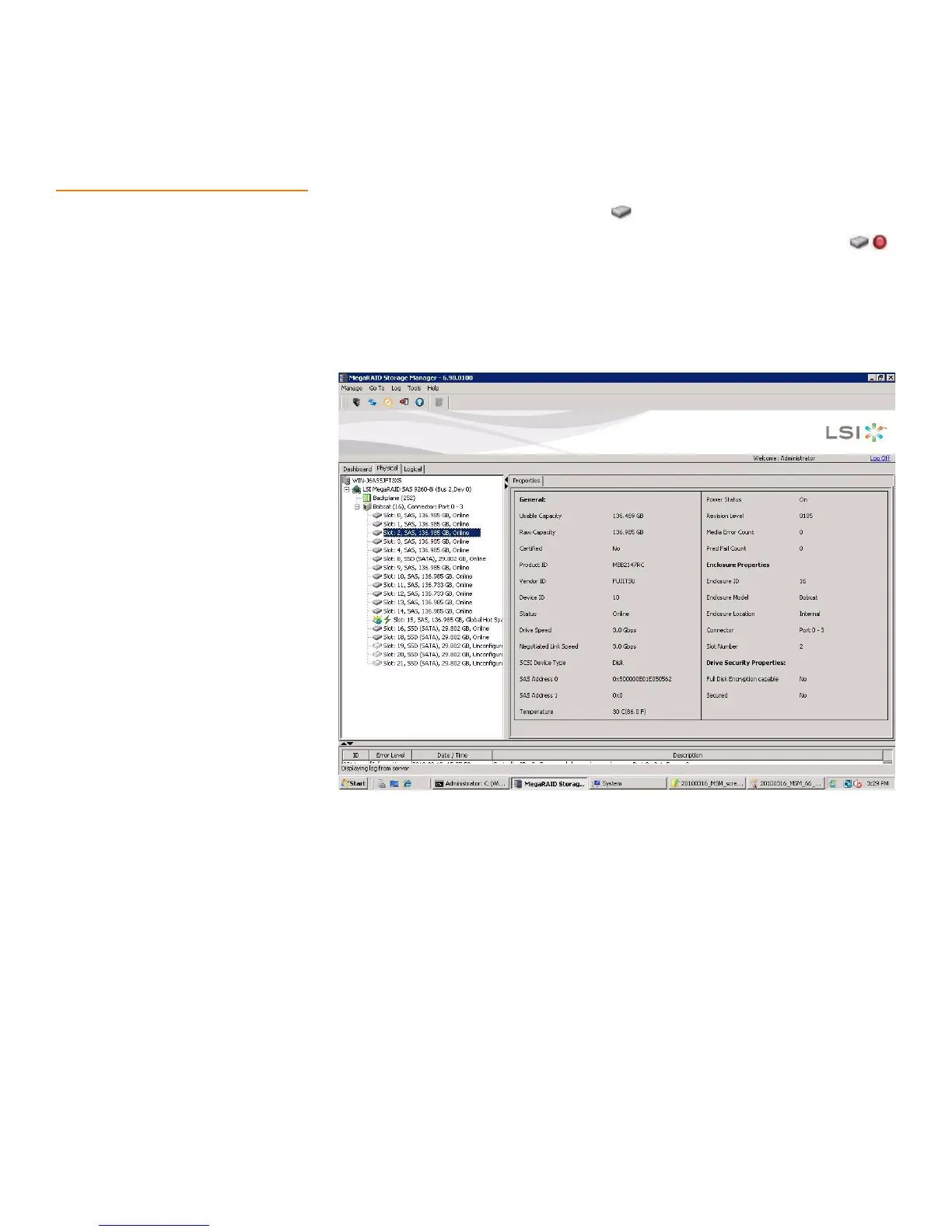 9.4 Monitoring Drives When MegaRAID Storage Manager software is running, you can see the status of all