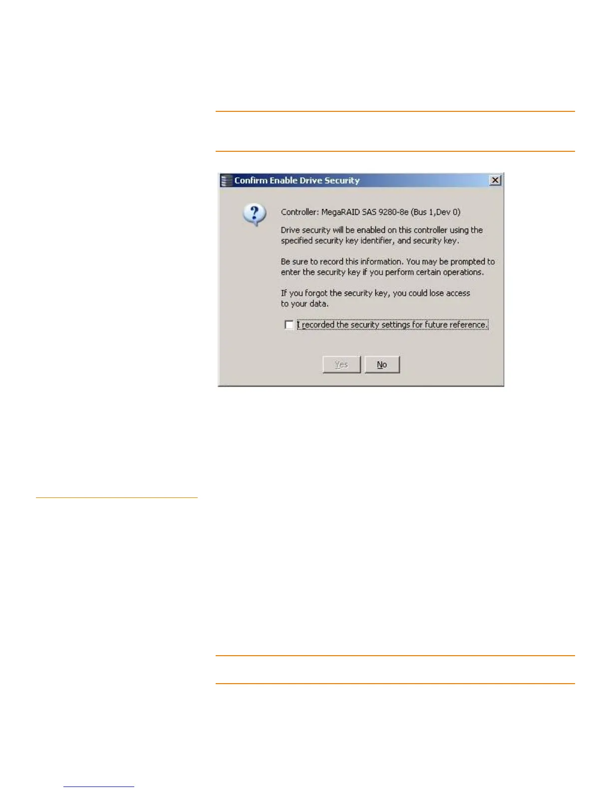 click Ye s to confirm that you want to enable drive security on this controller and