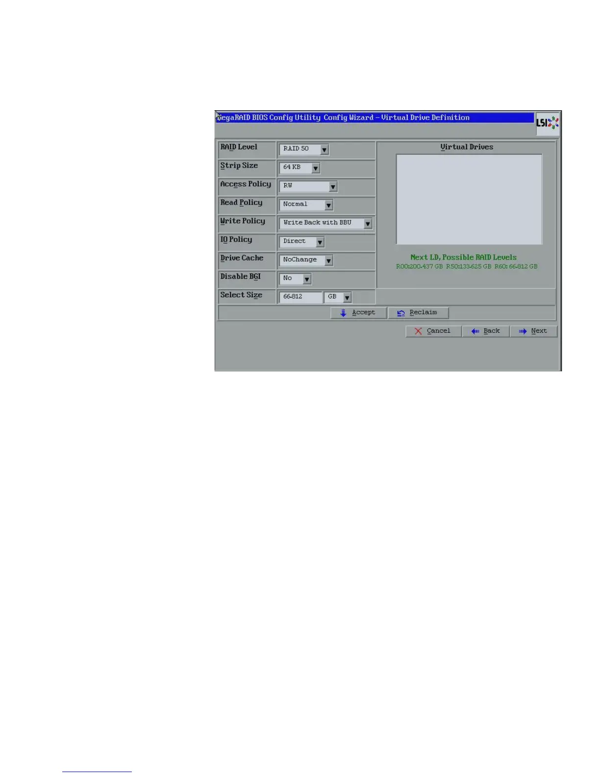 — RAID Level: The drop-down menu lists the possible RAID levels for the virtual